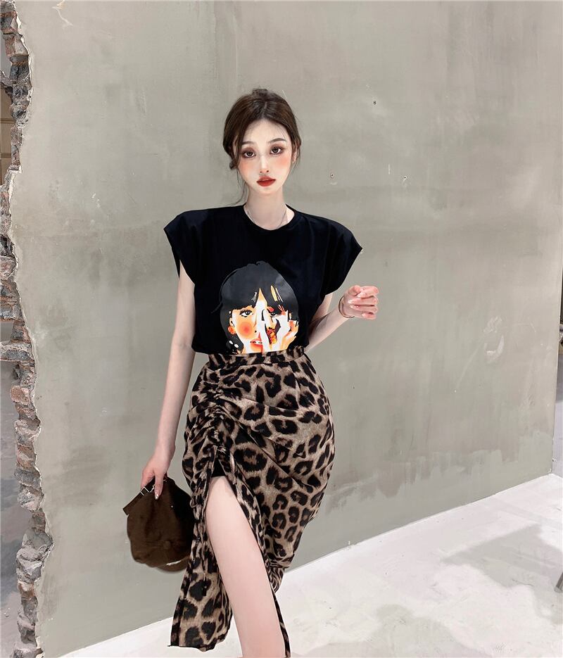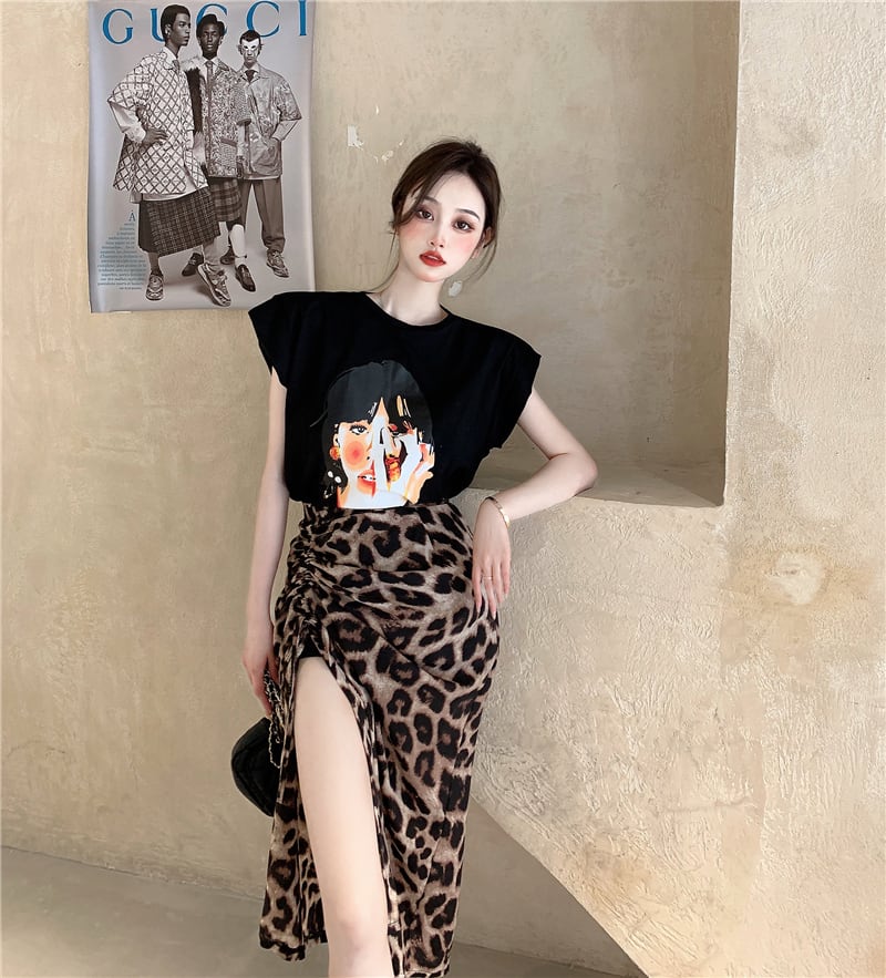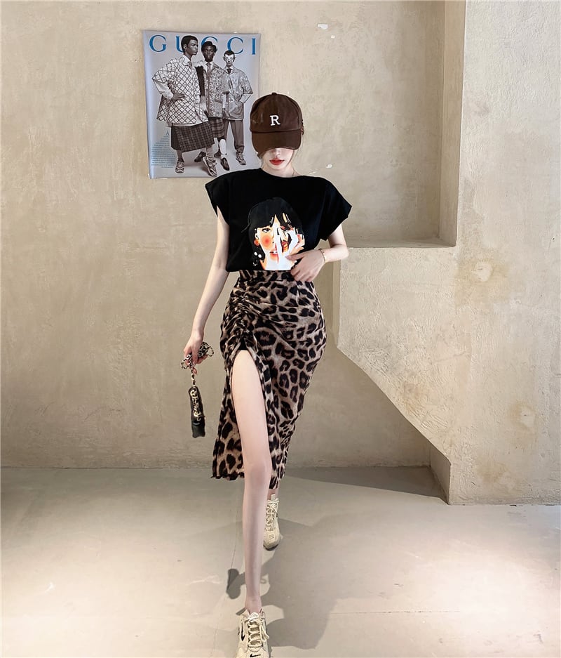 レオパードプリント柄スカート サマー薄手ハイウェストウェストスリムギャザー 夏物 セブンプリンセス80674123442
