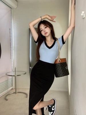 Vネック薄手スリムTシャツ サイドスリットハイウェストウェストロングスカート セブンプリンセス19450504258