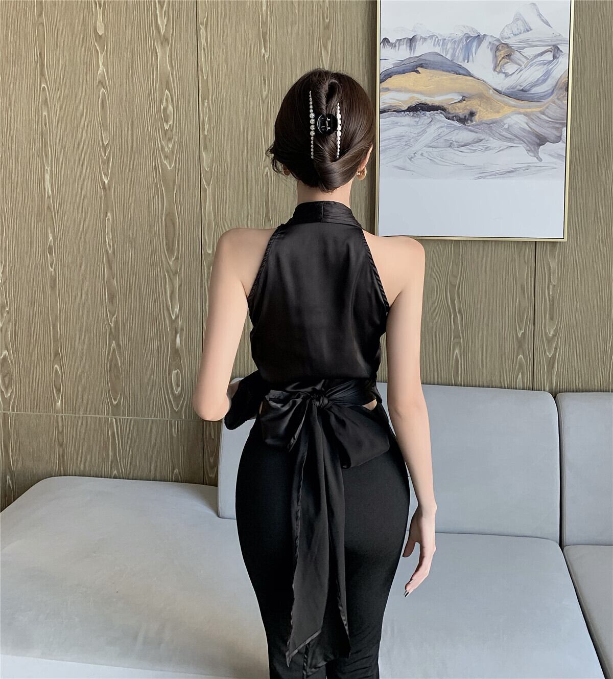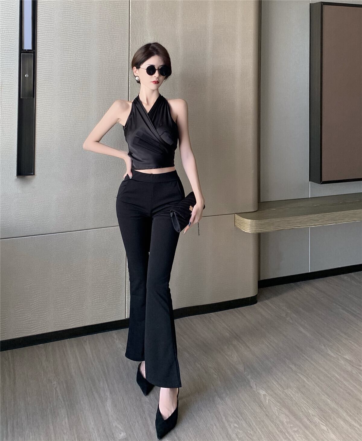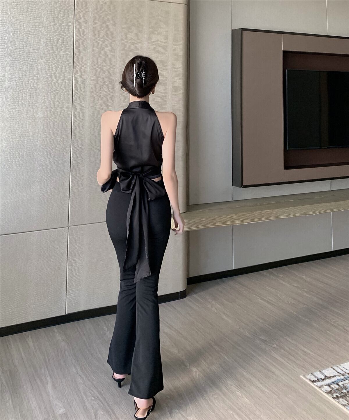 色:タイトップ,スリムフィットのフレアパンツ