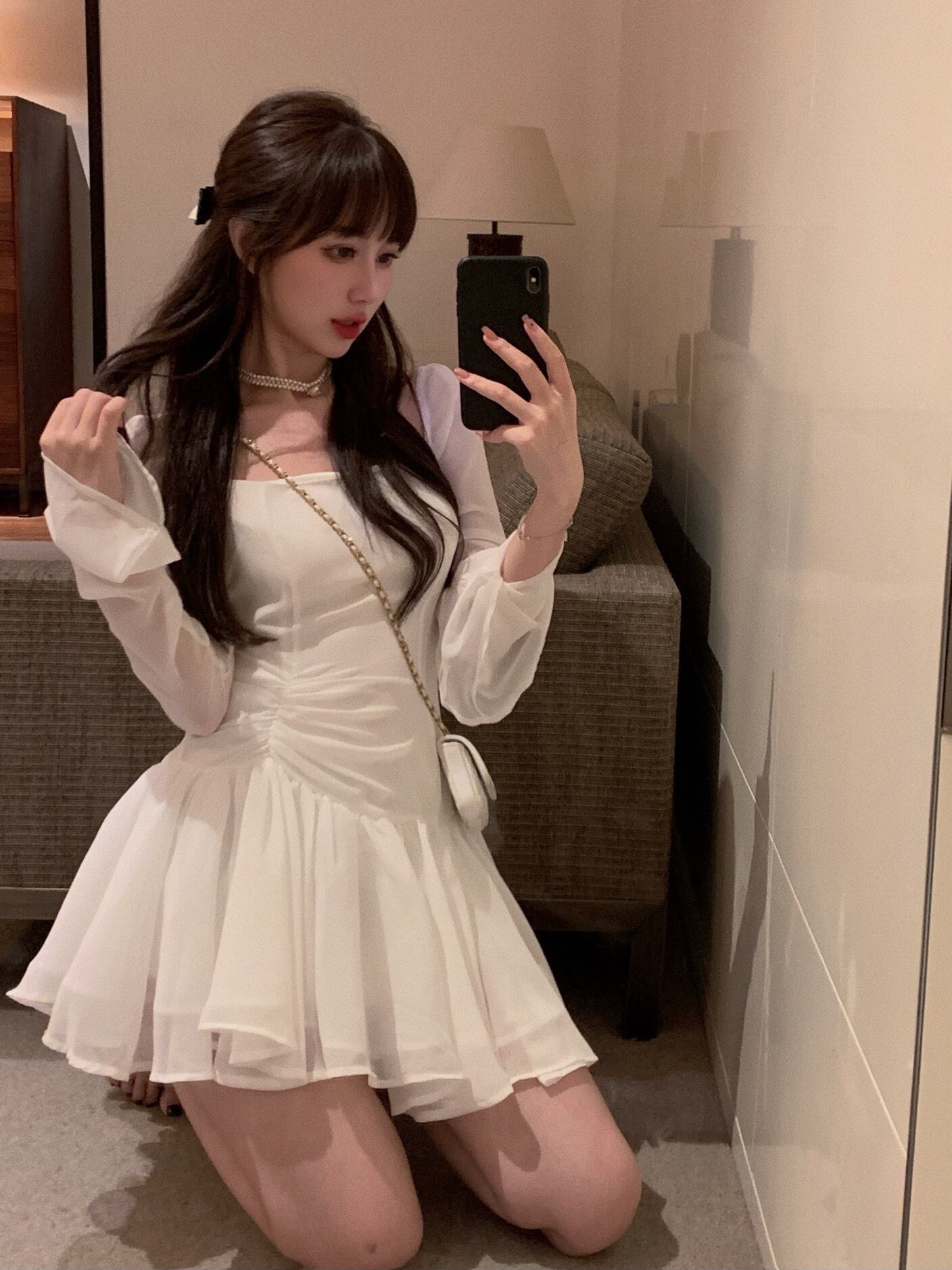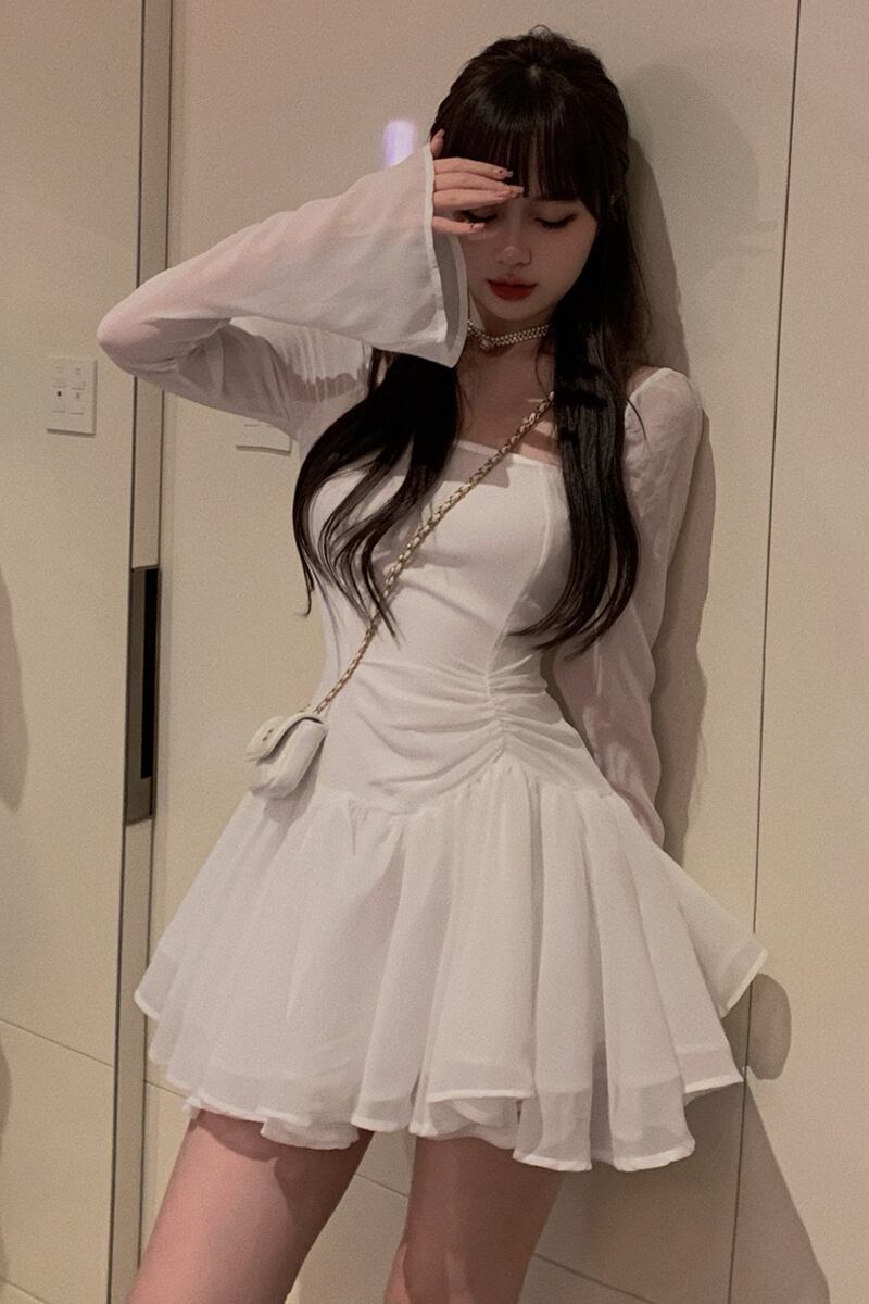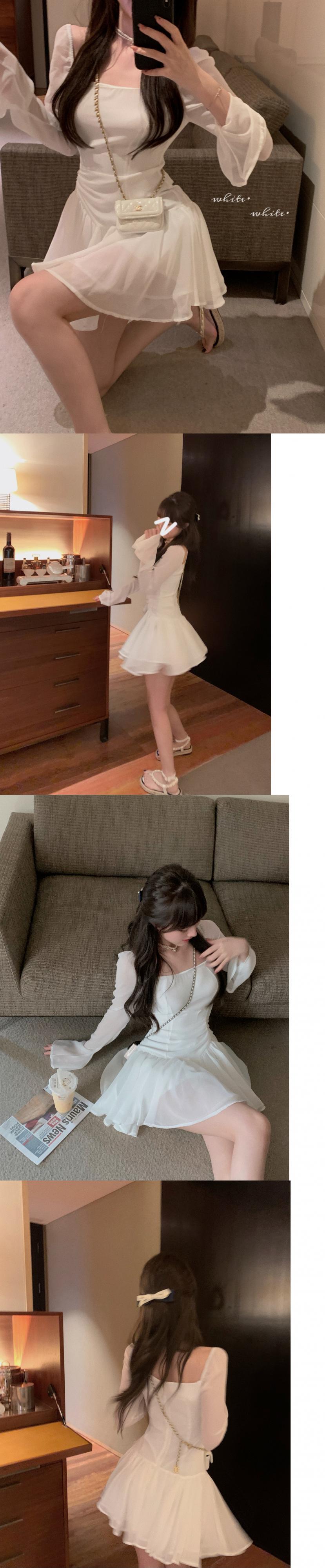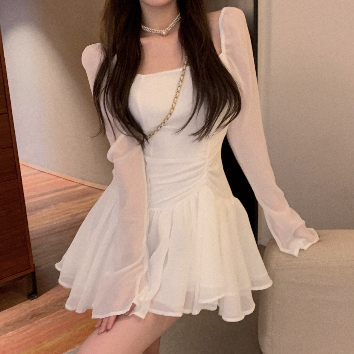 スリーブシフォンドレス サマーウェストホワイトAラインショートスカート 薄手 大人ガーリー スウィート キュート カジュアル 夏物 セブンプリンセス99996572510