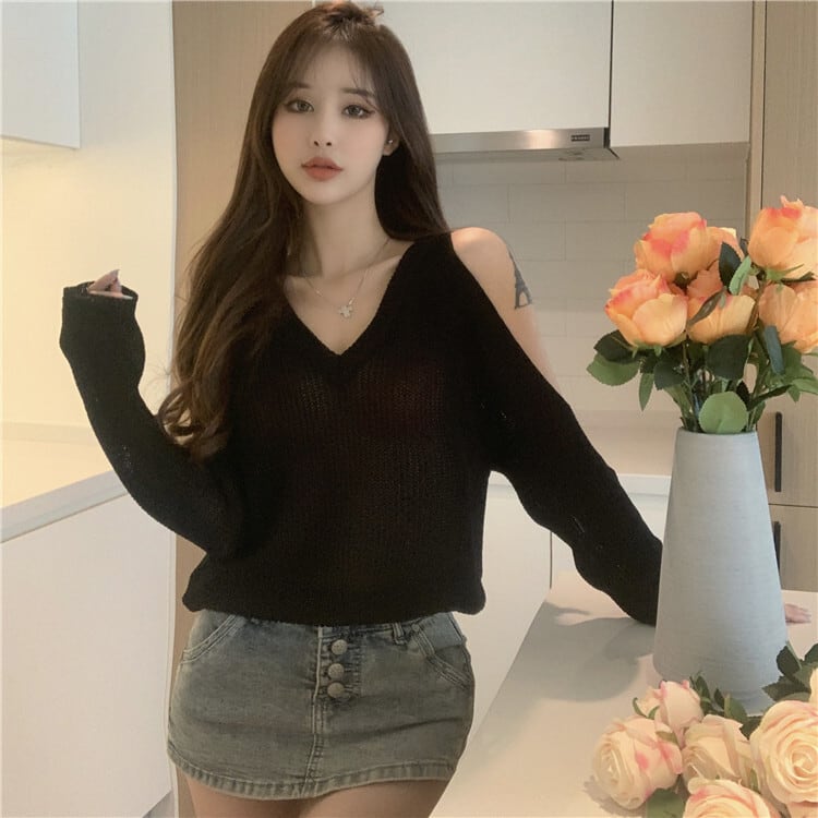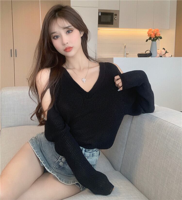 Vネックセーター サマー薄手スタイルソリッド カラールーズプルオーバー ロング ブラウス 夏物 オフショルダー ソリッドカラー セブンプリンセス73136557123