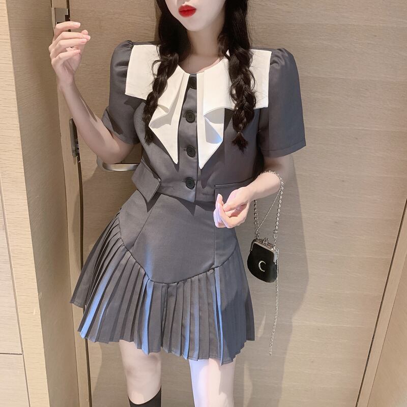 色:気質グレートップ,ホワイトトップ,テクスチャードブラックトップ,気質グレースカート,百の短いスカート,テクスチャード加工の黒いショートスカート