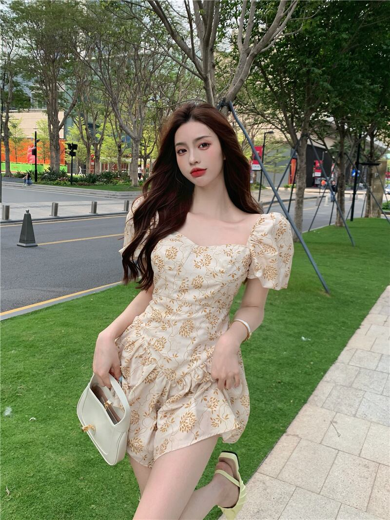 プリントカラースリーブハイウェストウェストスリムドレス ランタンスリーブ セブンプリンセス56271279570