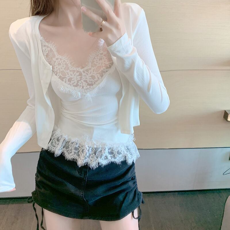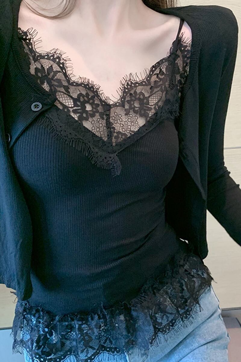 ミニレディーススタンダードVネックレースショートバックスリムノースリーブトップス レトロ セブンプリンセス56065854323