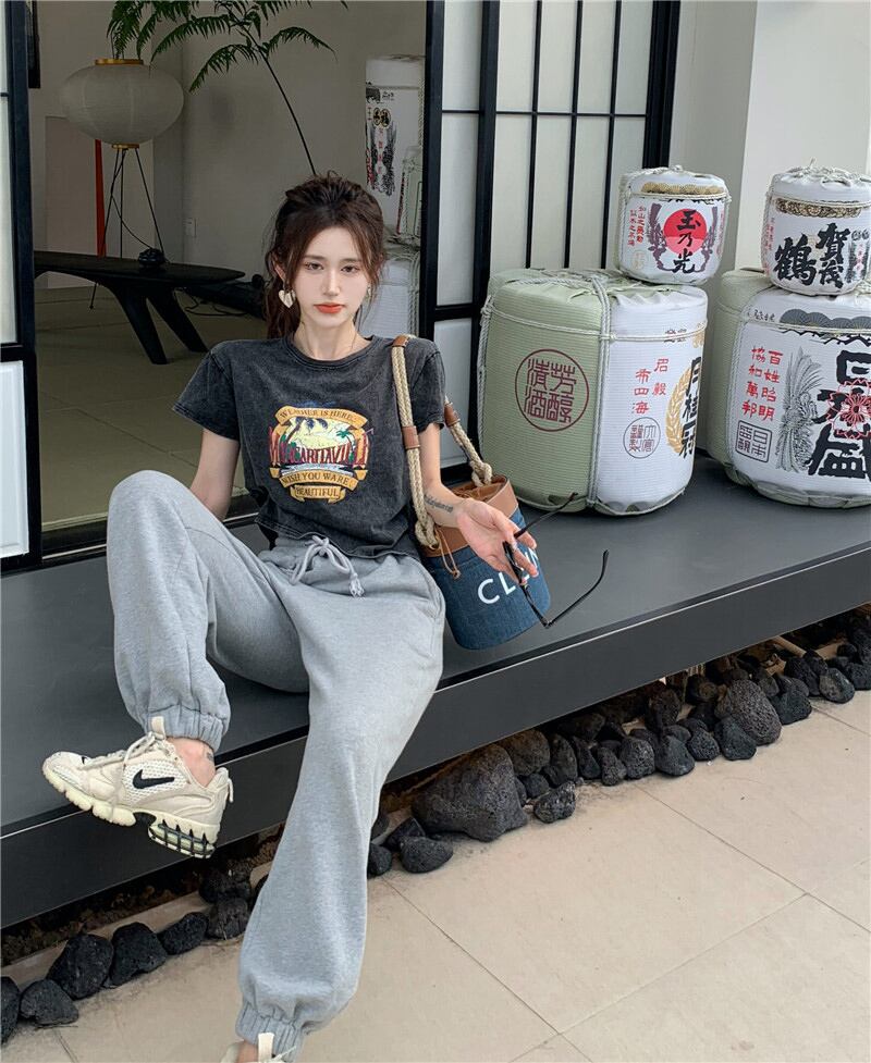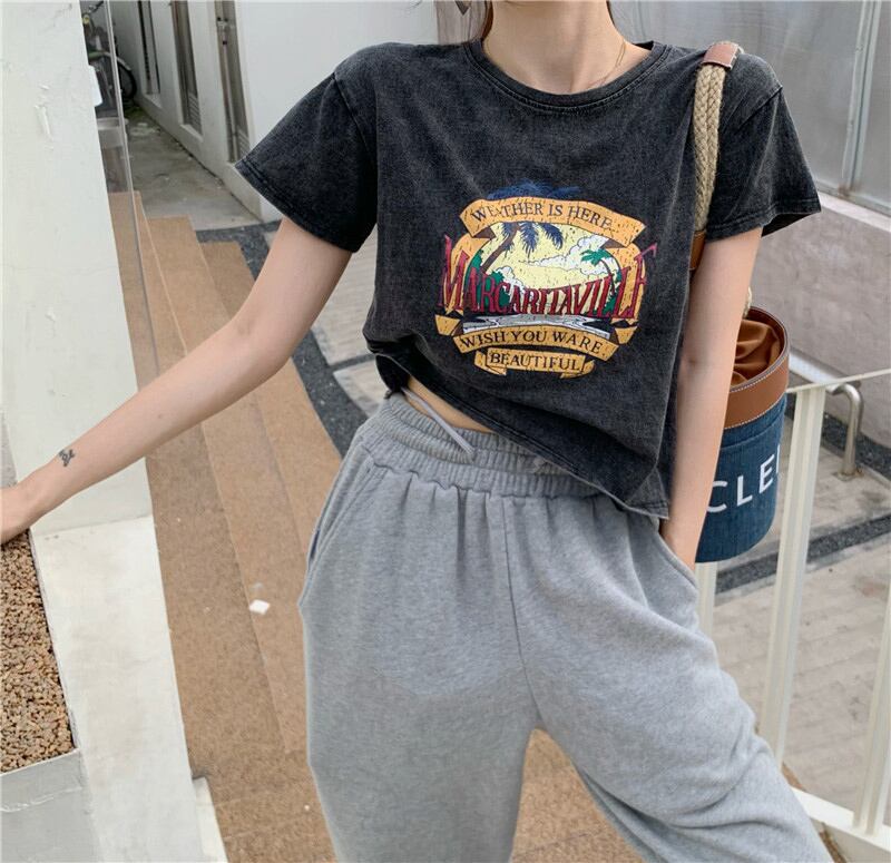 プリントTシャツ レディースサマー薄手ラウンドネックルーズカジュアルハイウェストウェストスリム半袖スリーブクロップトップ トップス ショート ハーフスリーブ 夏物 Oネック セブンプリンセス20031763215