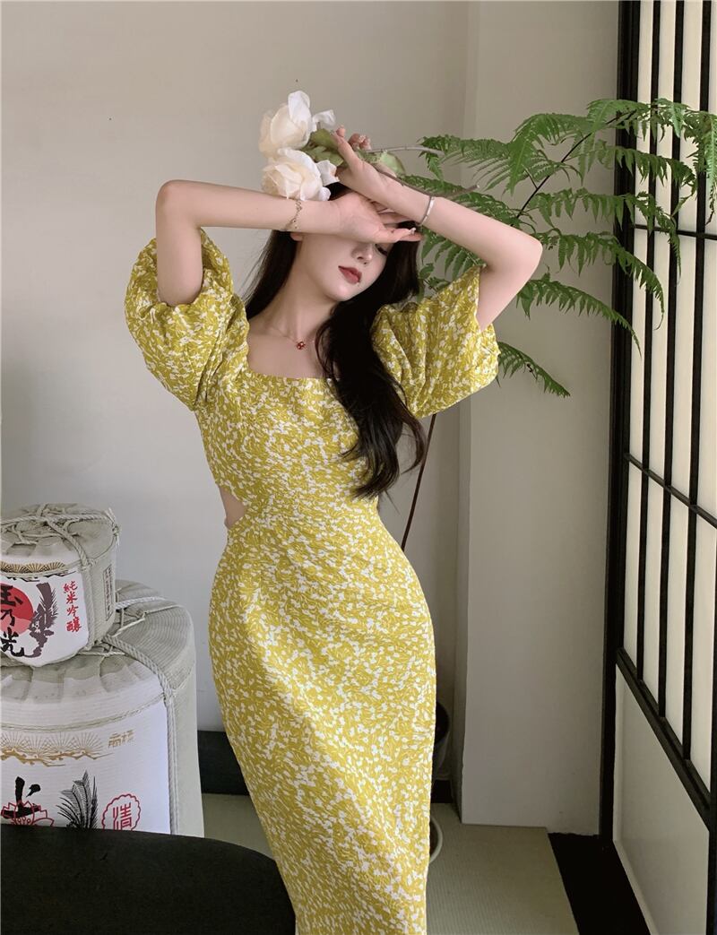 スリーブフローラルドレス レディースサマーウェストロングスカート 薄手イエロー 夏物 花柄 スクウェア セブンプリンセス9487484846
