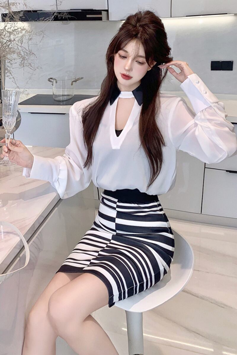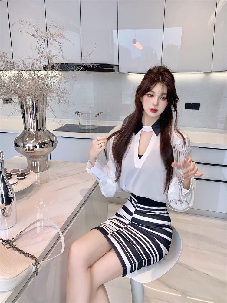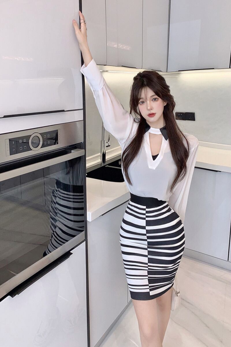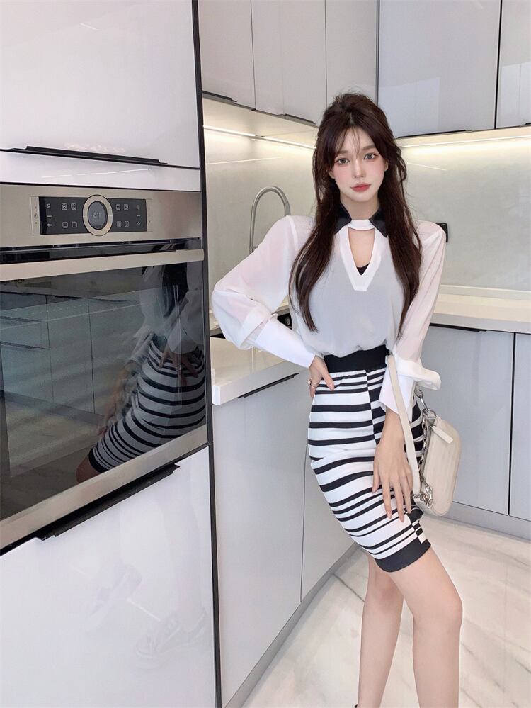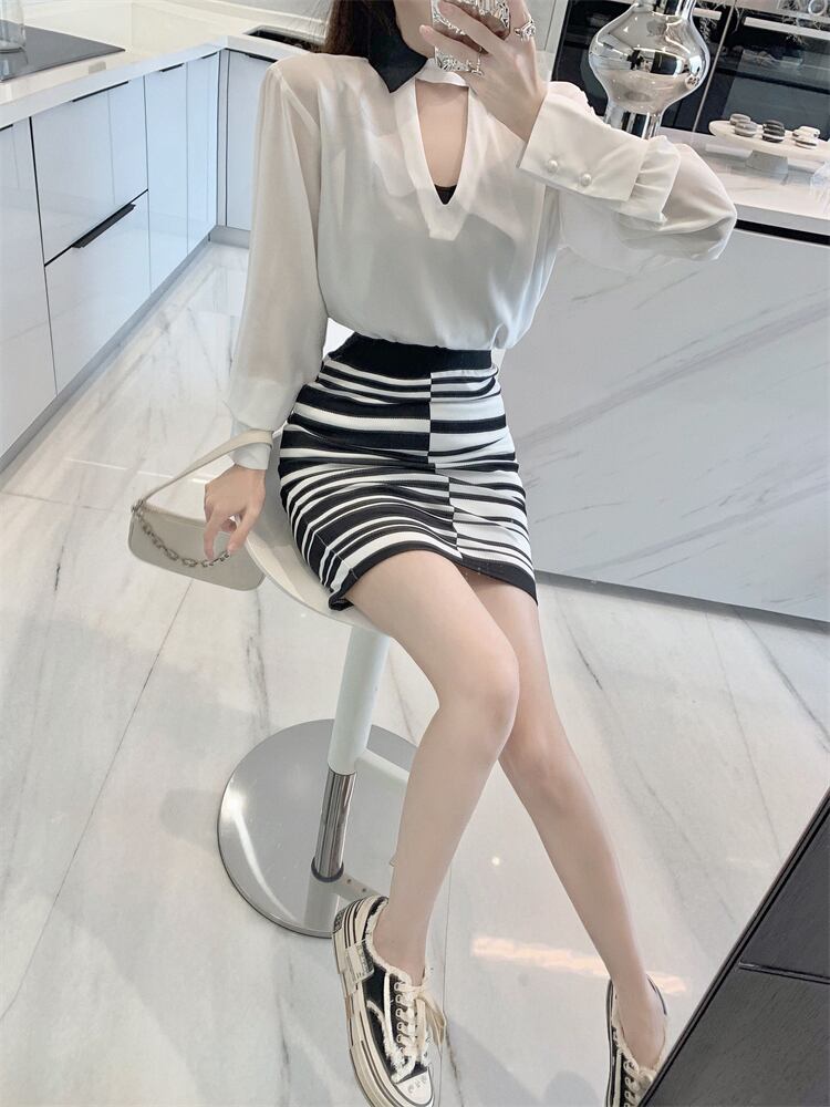 ブラックホワイトストライプハイウェストウェストAラインスカート サマー薄手スリムカラー 夏物 セブンプリンセス66776216046