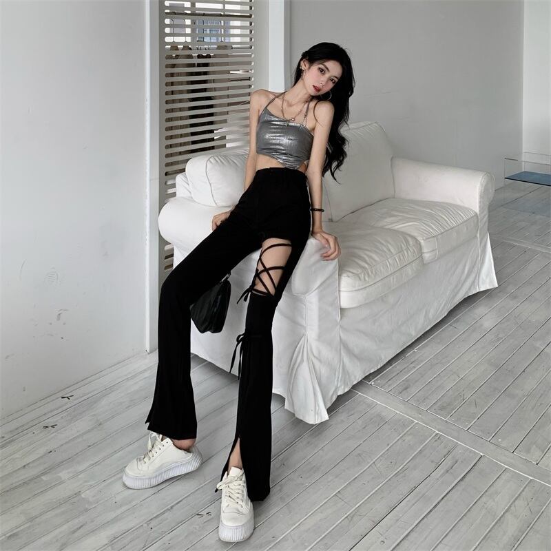 ブラックルーズパンツ サマー薄手スリットウェストワイドレッグレース レッド 夏物 ワイドパンツ セブンプリンセス63132076989