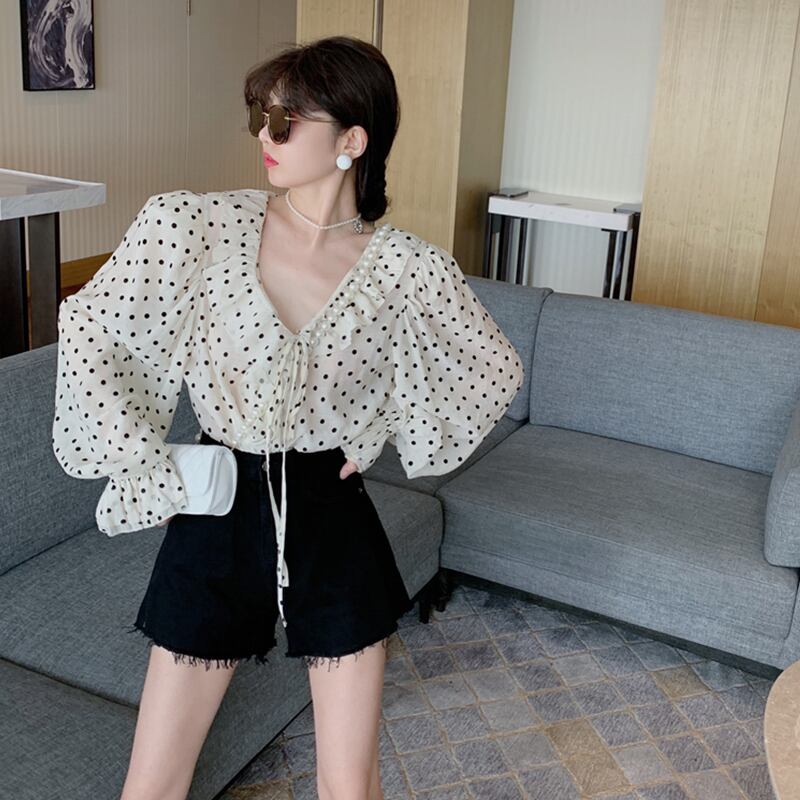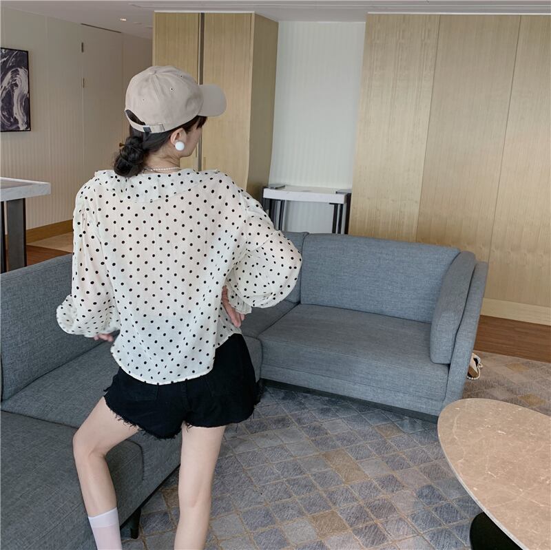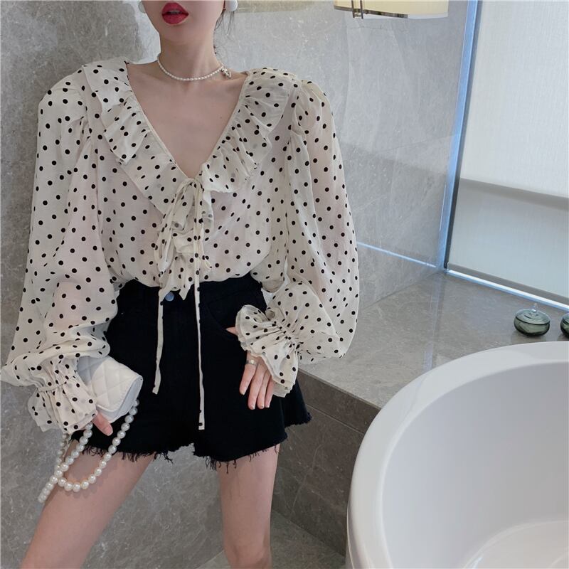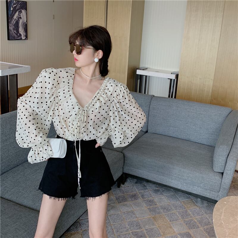 Vネックシャツ レディースサマー薄手ルーズスタンダード水玉トップス ロング レトロ 夏物 セブンプリンセス62758395250