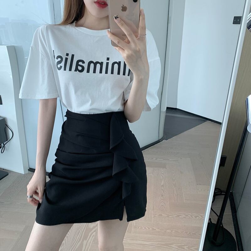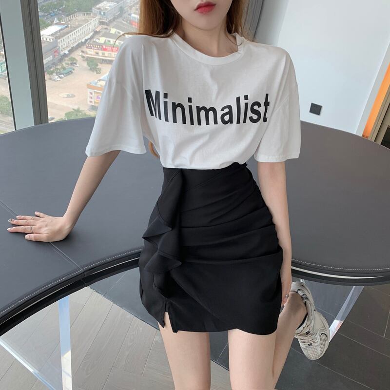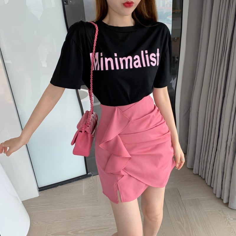 色:ピンクのスカート,黒スカート,ブラックレターTシャツ,ホワイトレターTシャツ