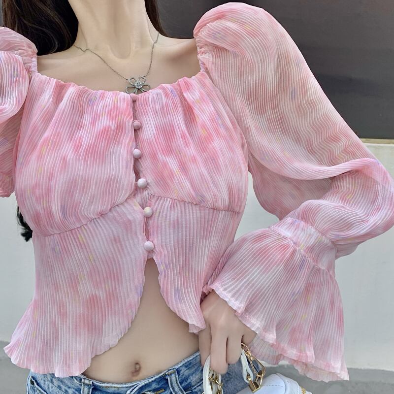 スリーブシフォンシャツ レディースサマー薄手ショートウェストトップス ピンク 半袖 ハーフスリーブ 夏物 オフショルダー スクウェア セブンプリンセス74890819035