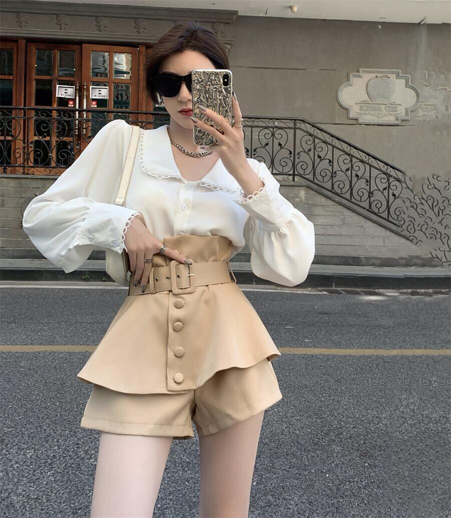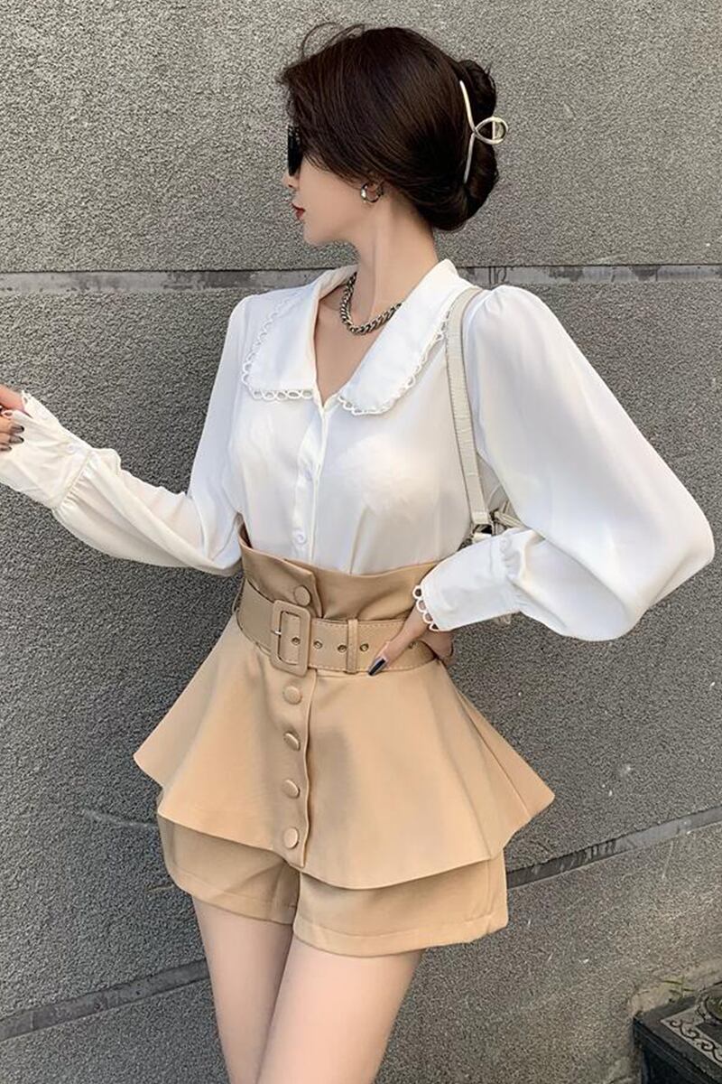 色:白のシャツ,カーキショートパンツ