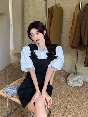色:白のシャツ,ブラックストラップドレス,カードカラーストラップドレス