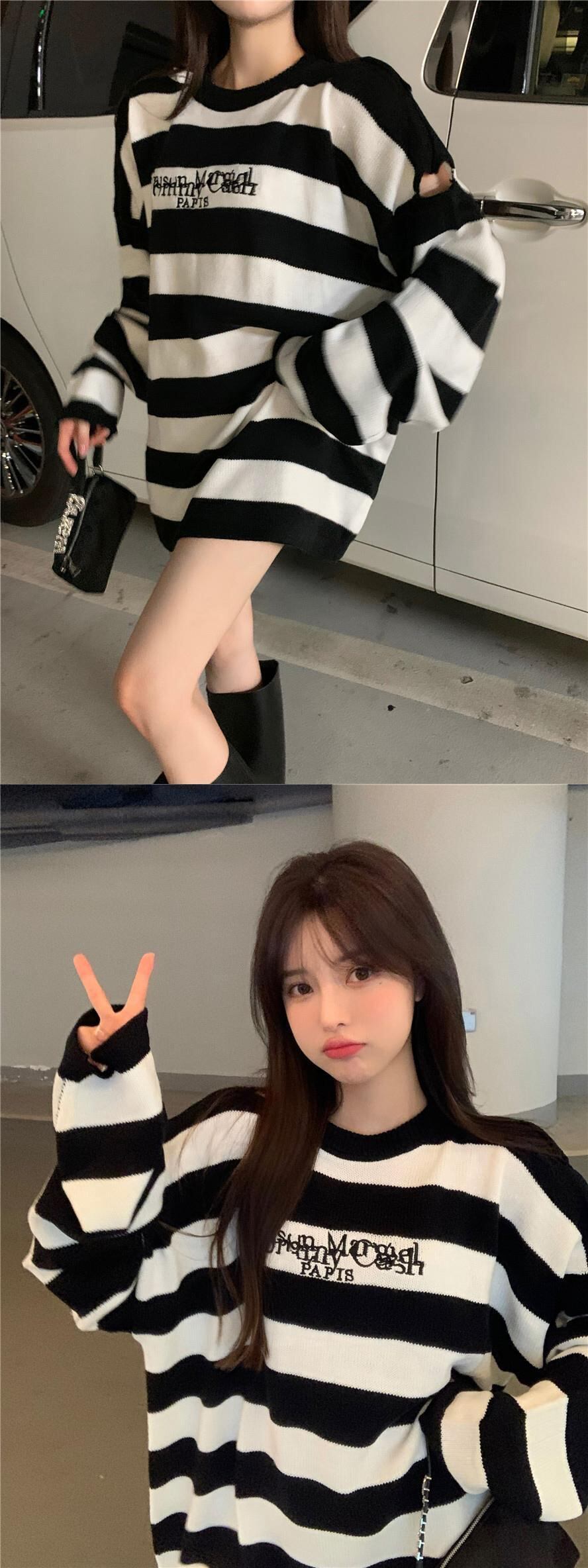 スタンダードルーズストライプセーター レッド レトロ 刺繍 ヨーロピアン セブンプリンセス93880692767
