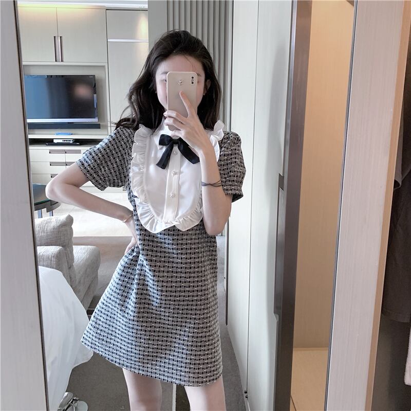 カラードレス サマースリーブ格子柄スカート 薄手 リボン 夏物 セブンプリンセス91112609758