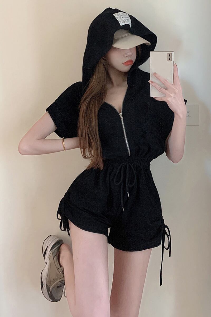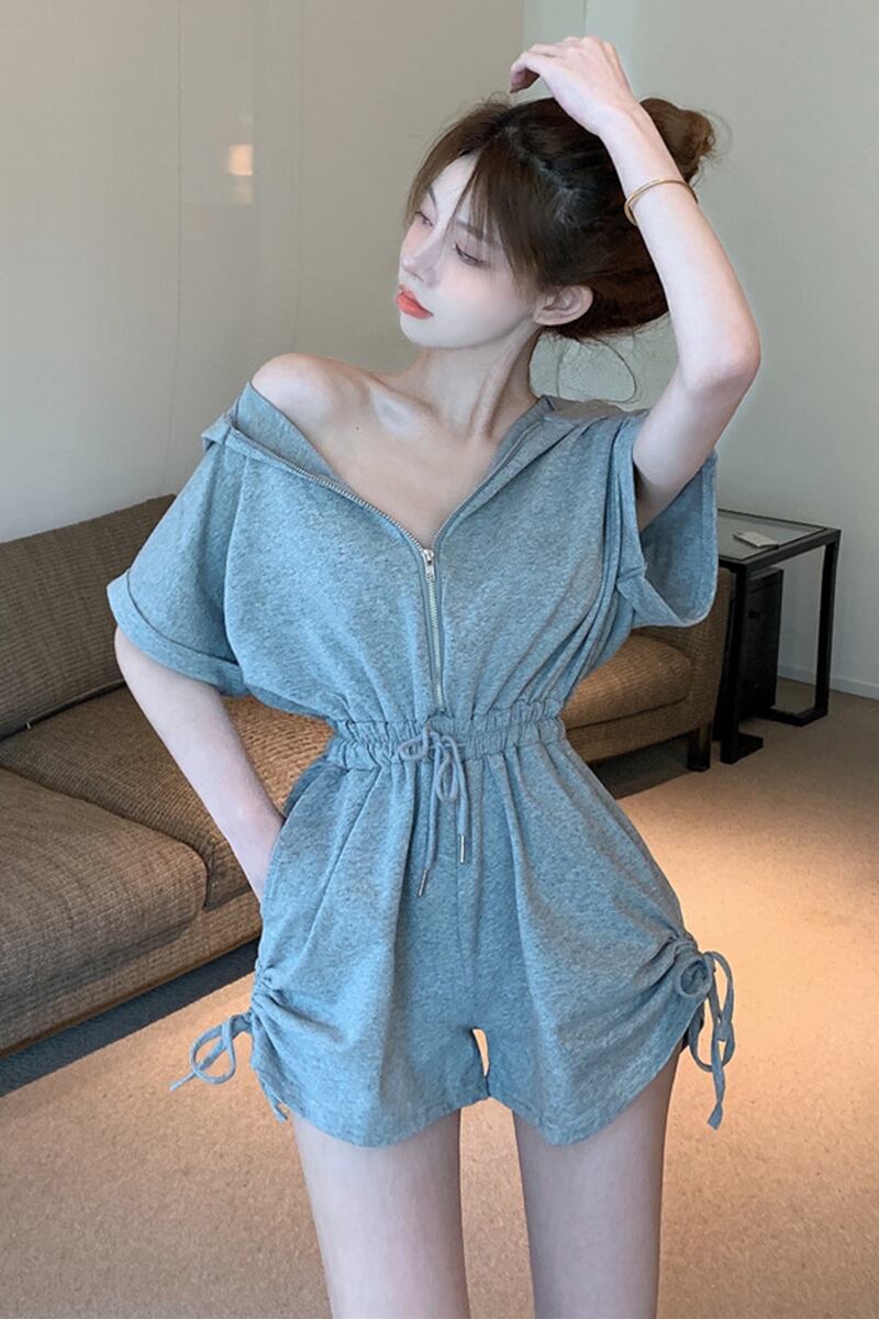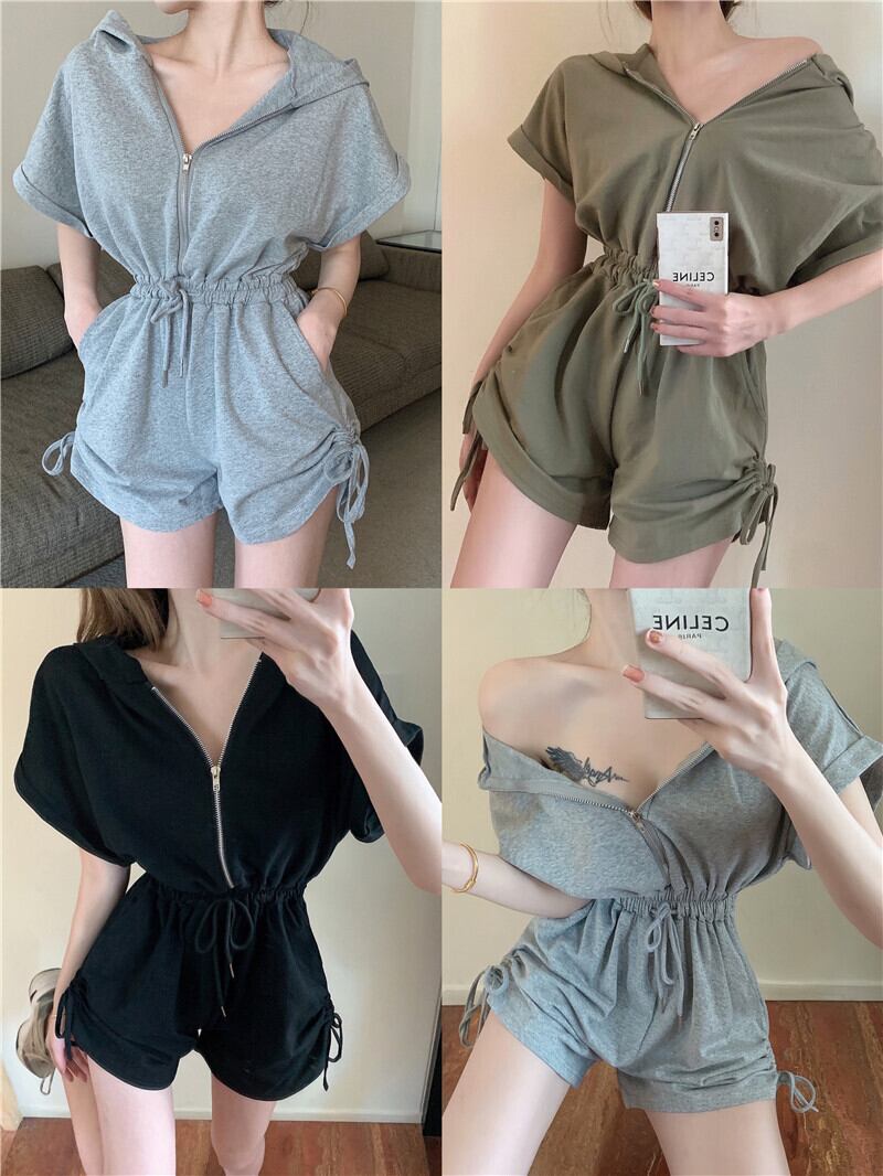 フードジャンプスーツ オールインワン サマー薄手ギャザーウェストハイウェストワイドレッグカジュアルパンツ 夏物 ワイドパンツ セブンプリンセス8677536994