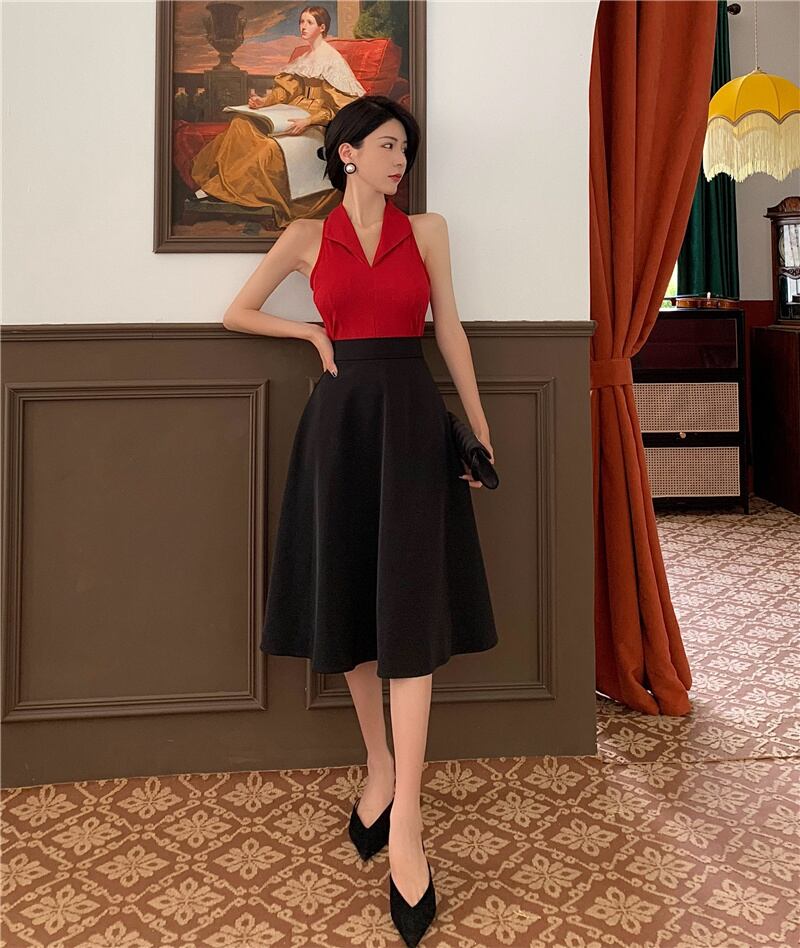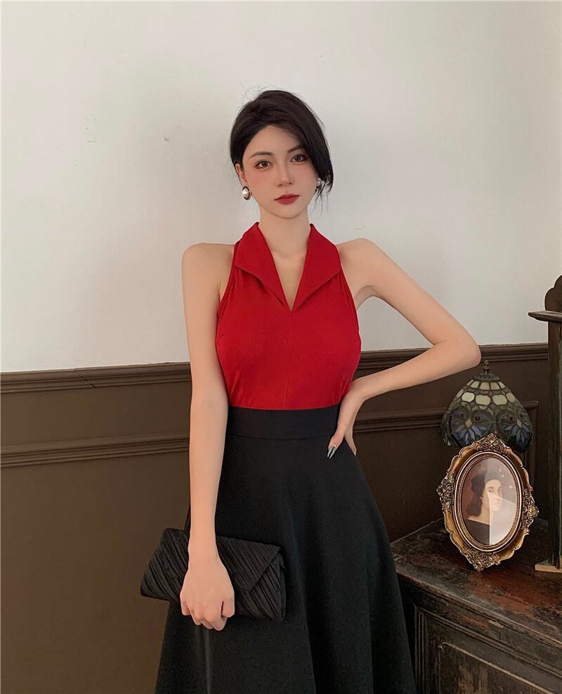 レッドニットサマー薄手ホルターVネックスタンダードショートジャケット レトロ 夏物 セブンプリンセス13527179068