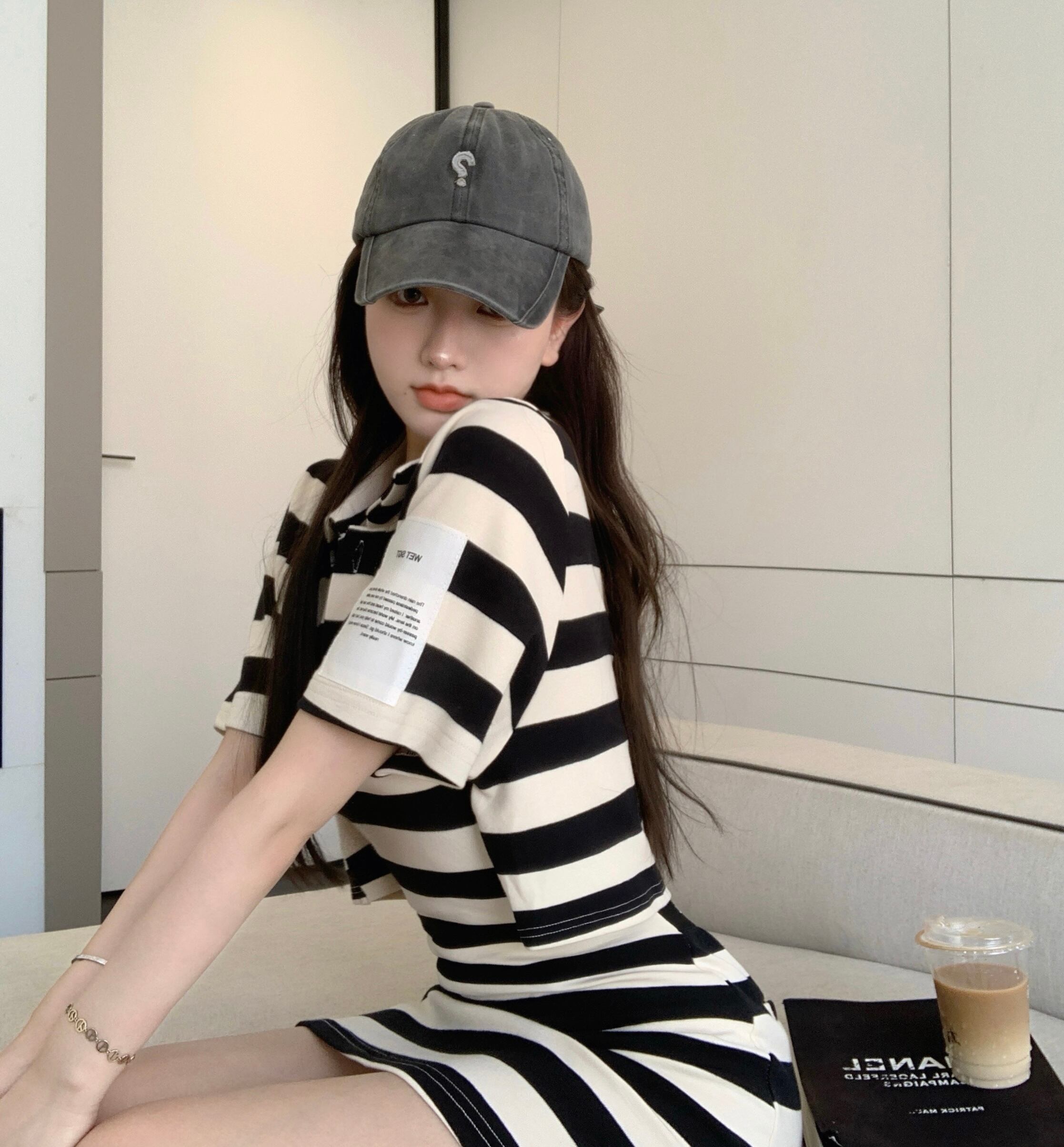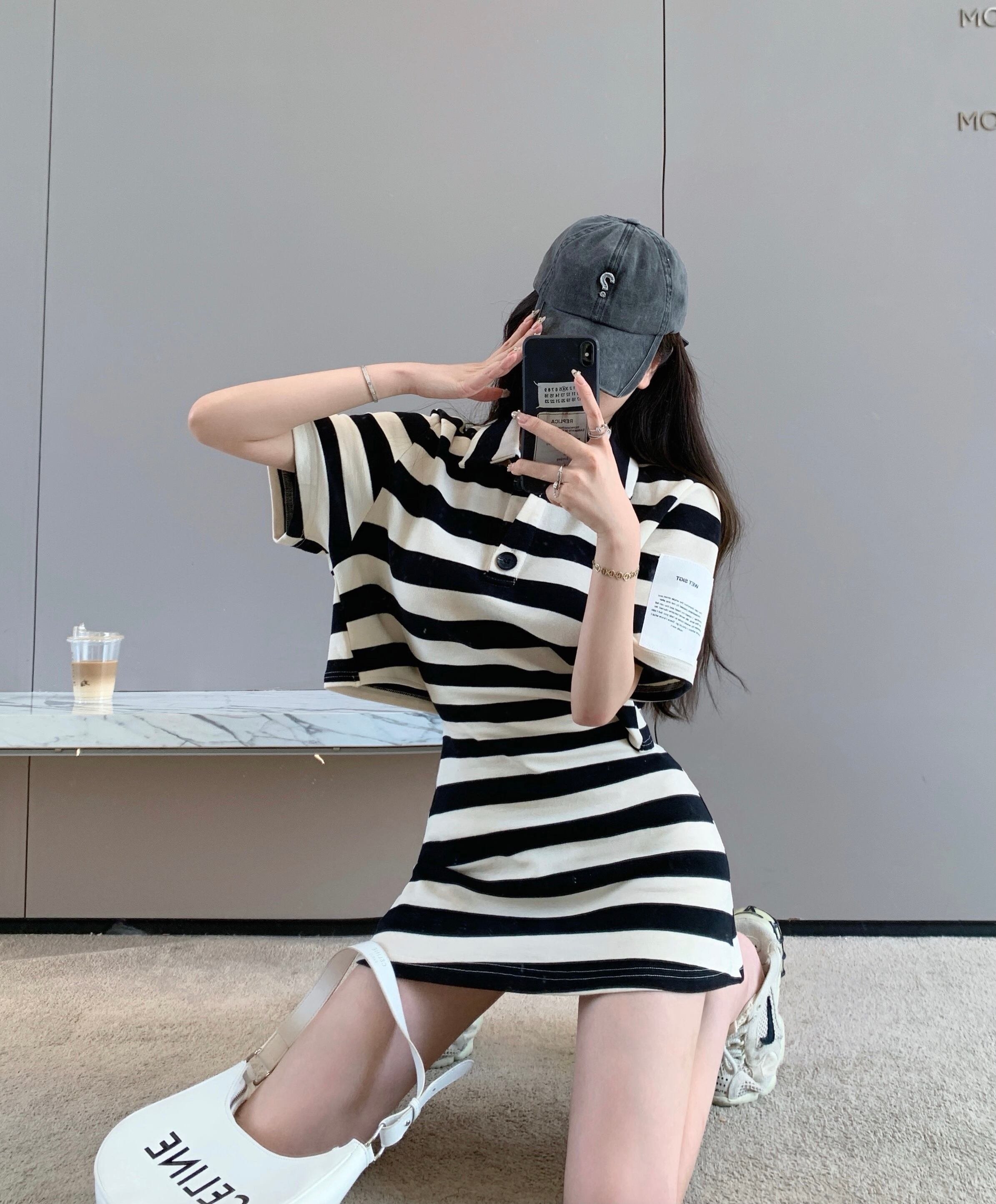 ストライプTシャツ ドレス サマー薄手カジュアルロングスカート ウェストバックレス 夏物 セブンプリンセス36122150867