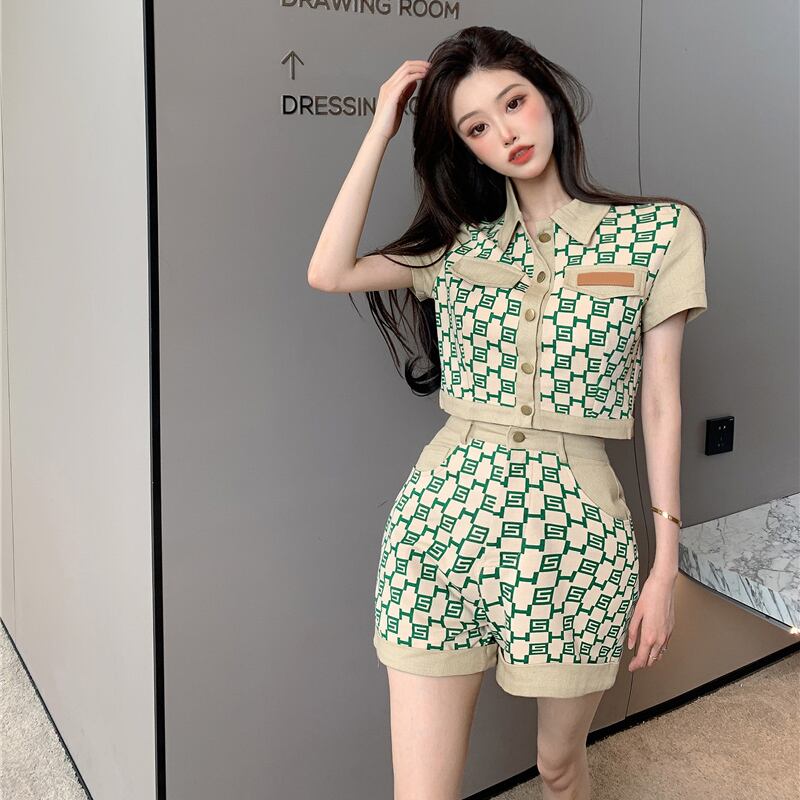 サマースタンダードカラーカーディガンシャツ ハイウェストプリントパンツ ショーツ レトロ 夏物 ブルマー セブンプリンセス89786703864