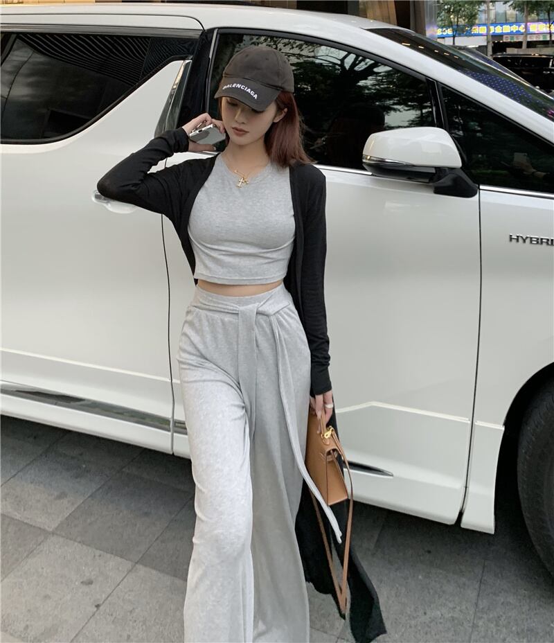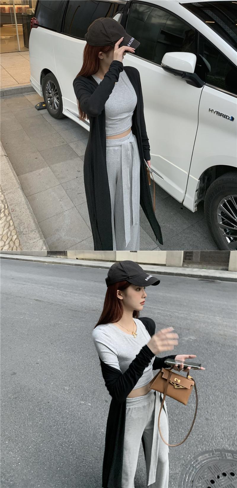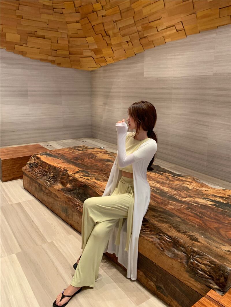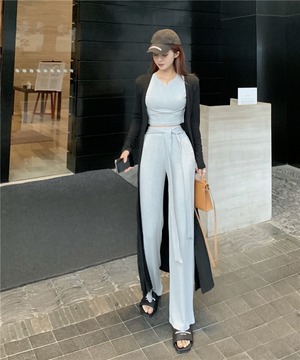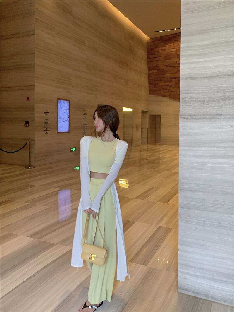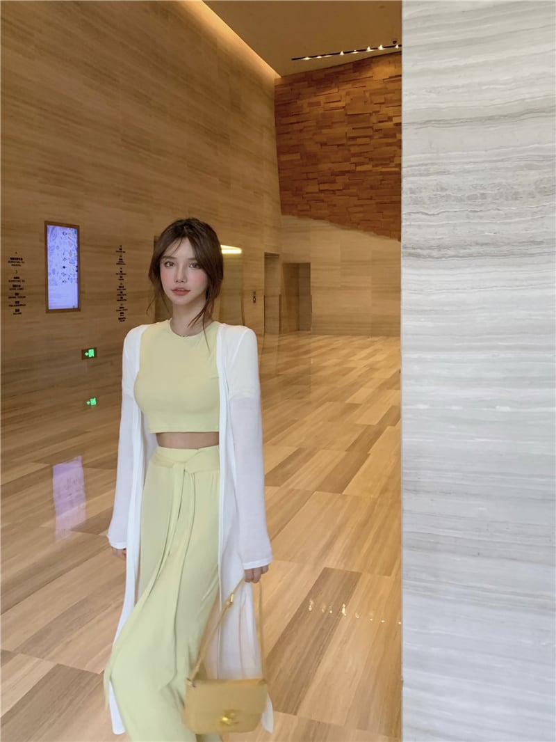 色:白いカーディガン,ブラックカーディガン,黄色のズボン,イエロートップ,グレーパンツ,グレートップ