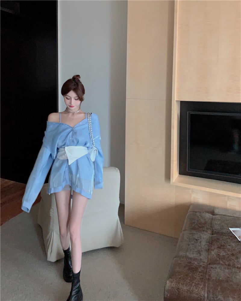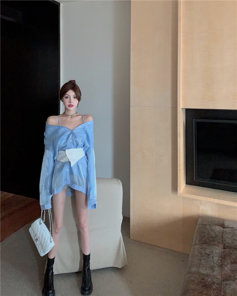 ブルーシャツ レディースサマー薄手ロングサテントップス 夏物 セブンプリンセス84064313425