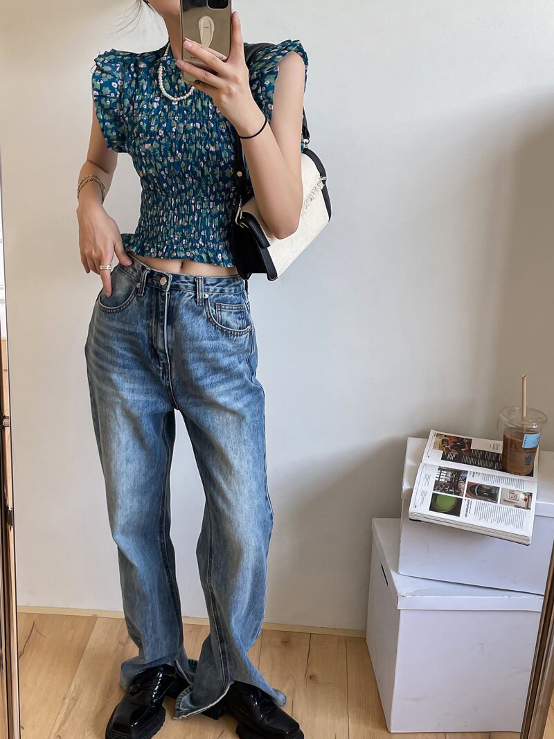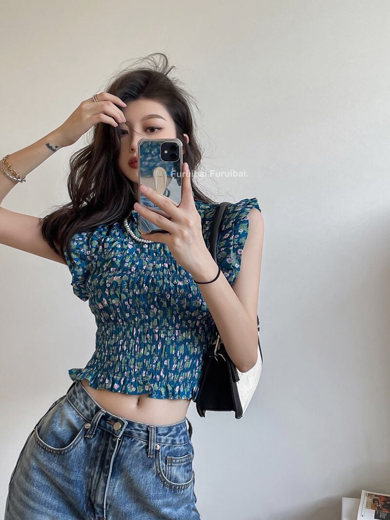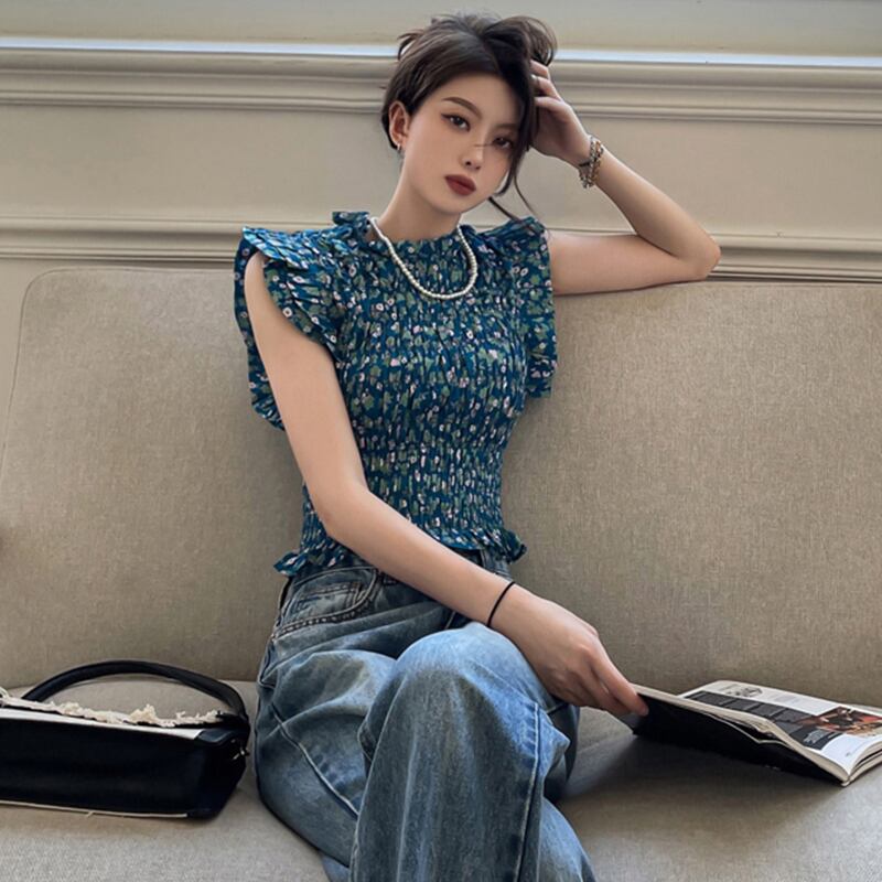 ノースリーブフローラルシャツ トップス サマーショートウェストスタンダード レトロ 夏物 花柄 セブンプリンセス74644063123