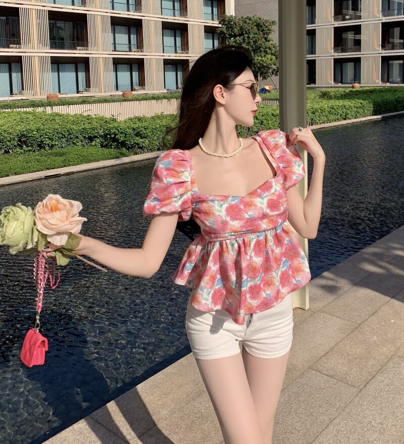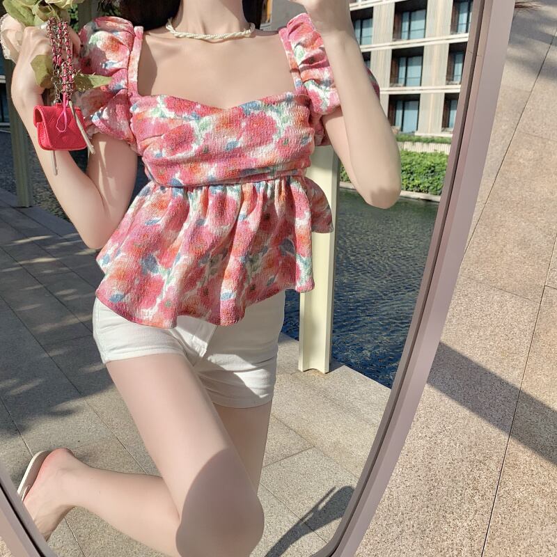 スリーブフローラルシャツ レディースサマー薄手スタイル半袖トップス ショート ハーフスリーブ 夏物 花柄 スクウェア セブンプリンセス46479875641