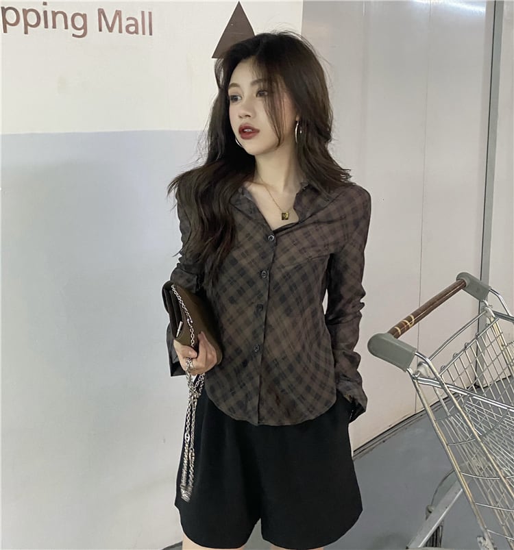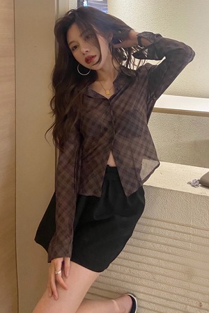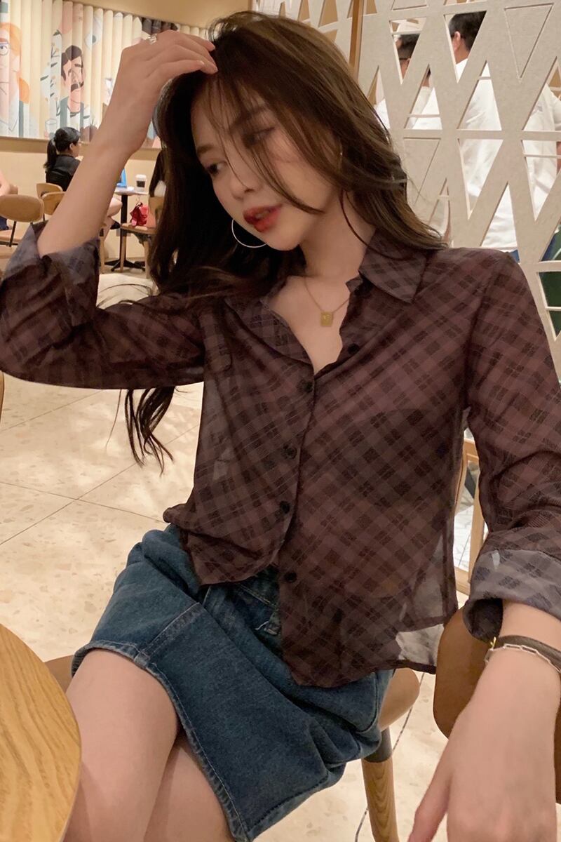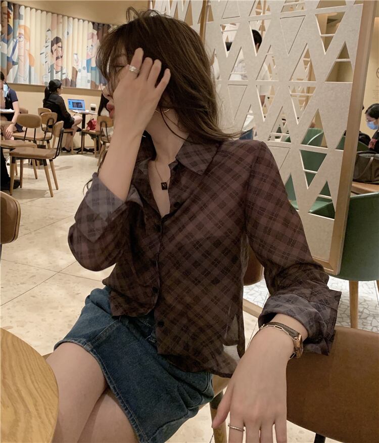 スタンダード格子柄シャツ サマー薄手カジュアルカーディガントップス ロング レトロ 夏物 セブンプリンセス2217191728