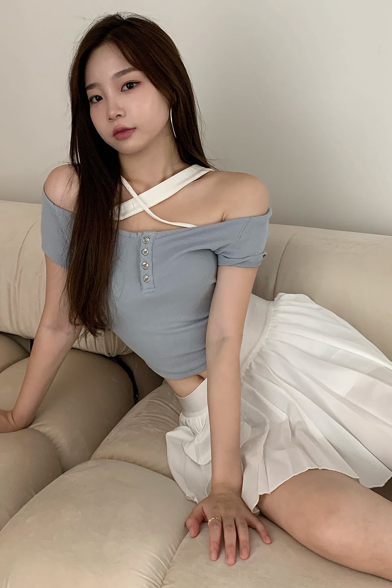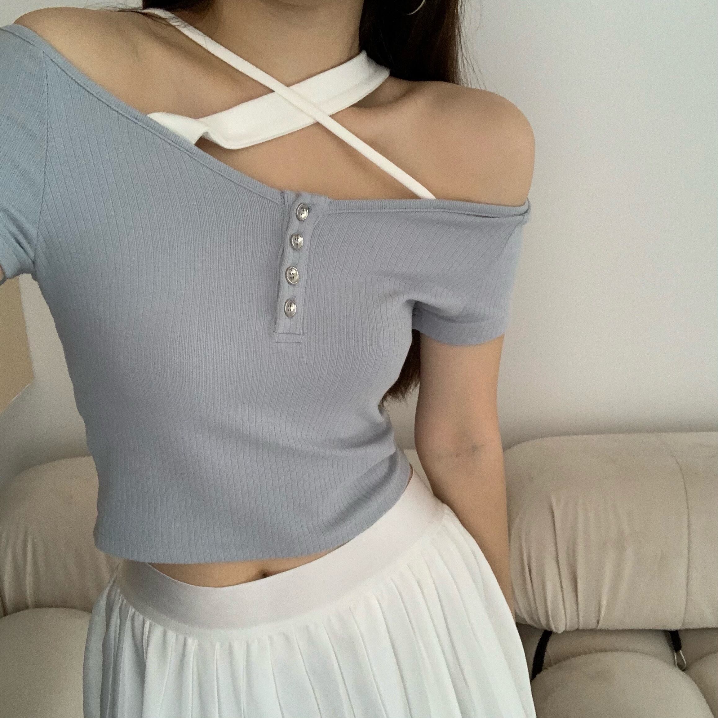 ブルーTシャツ サマー薄手ショートスリムトップス 夏物 セブンプリンセス1698531744