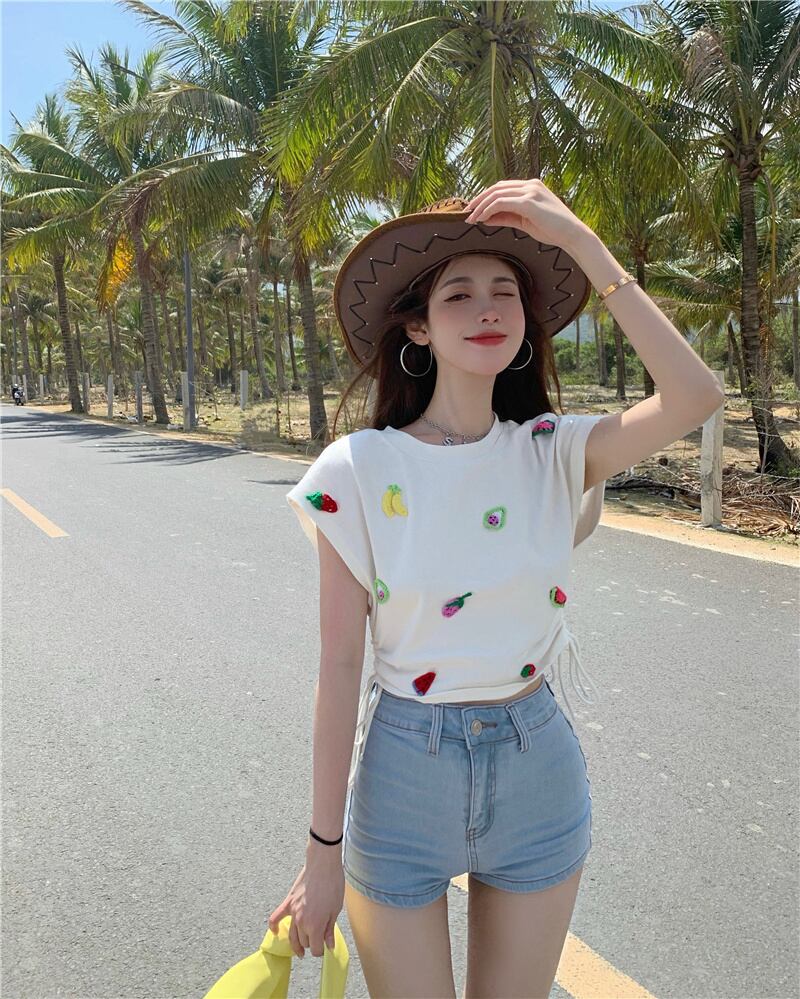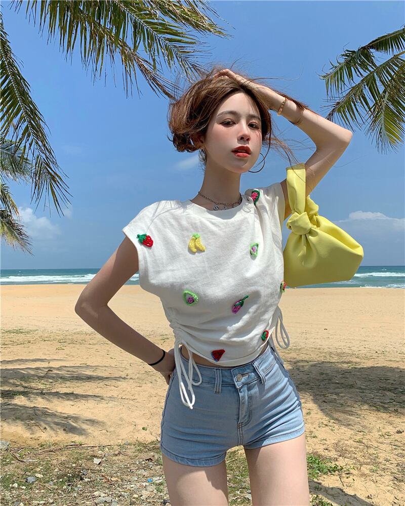 Tシャツ サマーギャザー刺繍薄手ショートトップス 大人ガーリー スウィート キュート カジュアル 夏物 セブンプリンセス58599402924