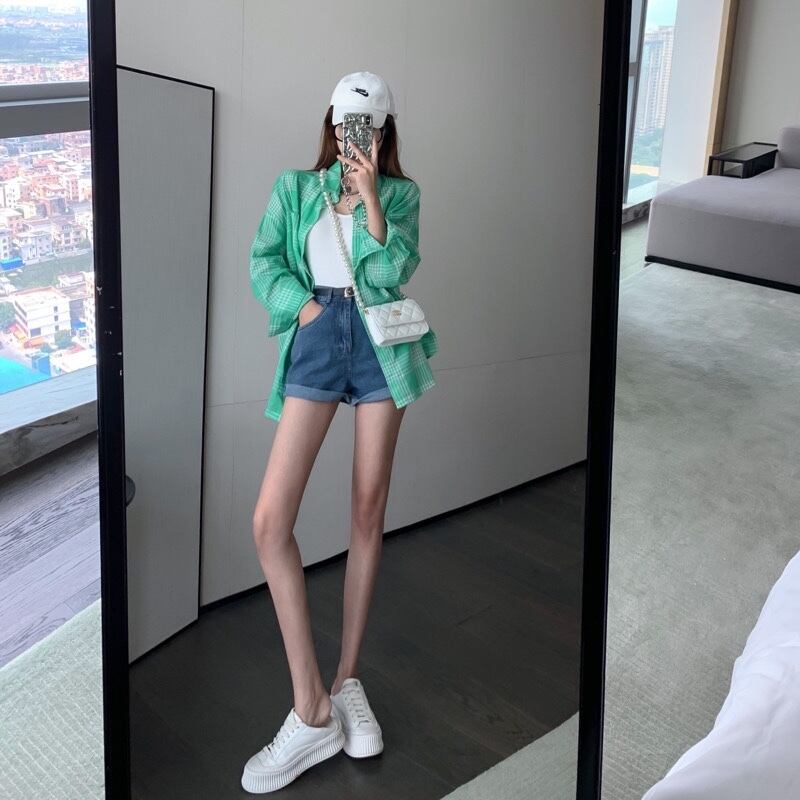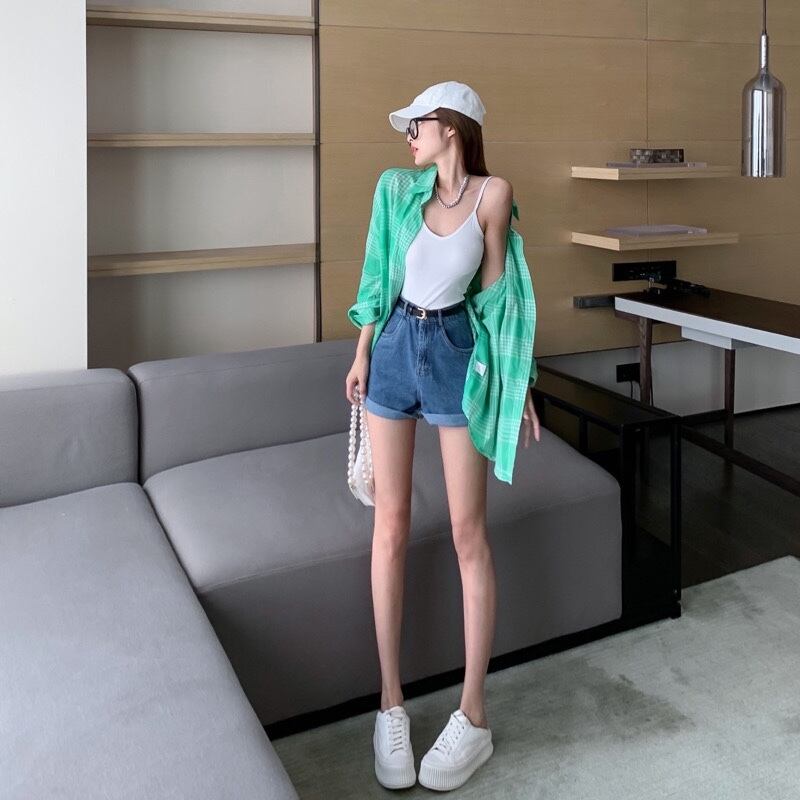 色:ホワイトサスペンダー,緑のシャツ,デニムショートパンツ