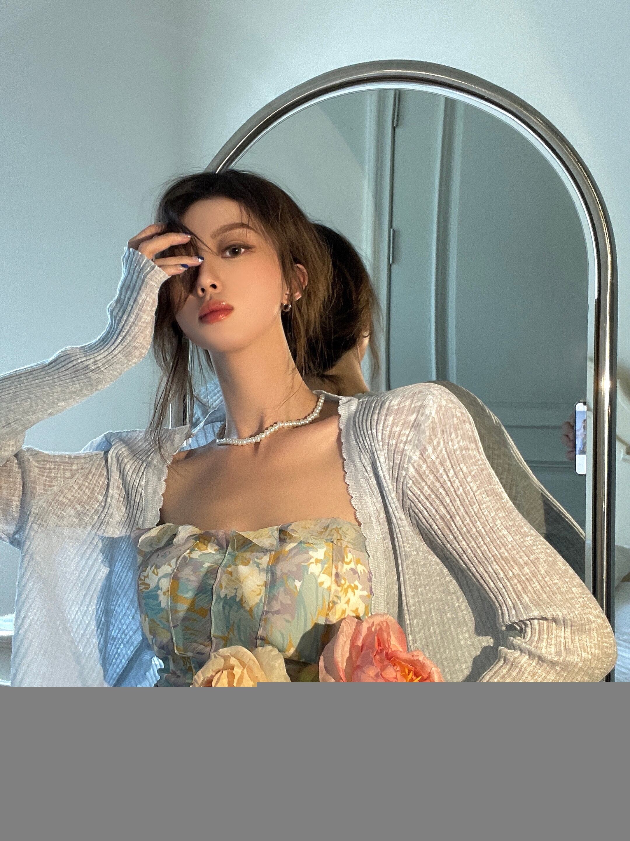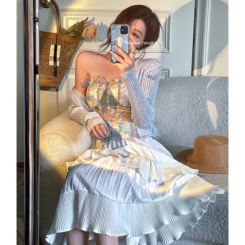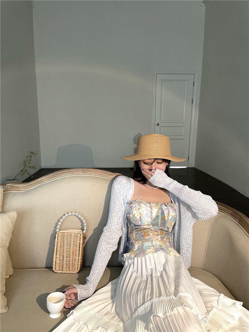 色:白いドレス,チューブトップ,グレーのカーディガン