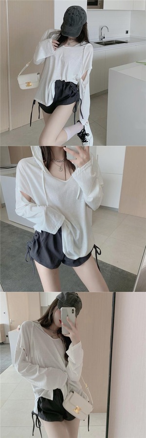 フードTシャツ サマー薄手ブラウス ルーズカジュアルブルートップス ロング 夏物 セブンプリンセス17897341454