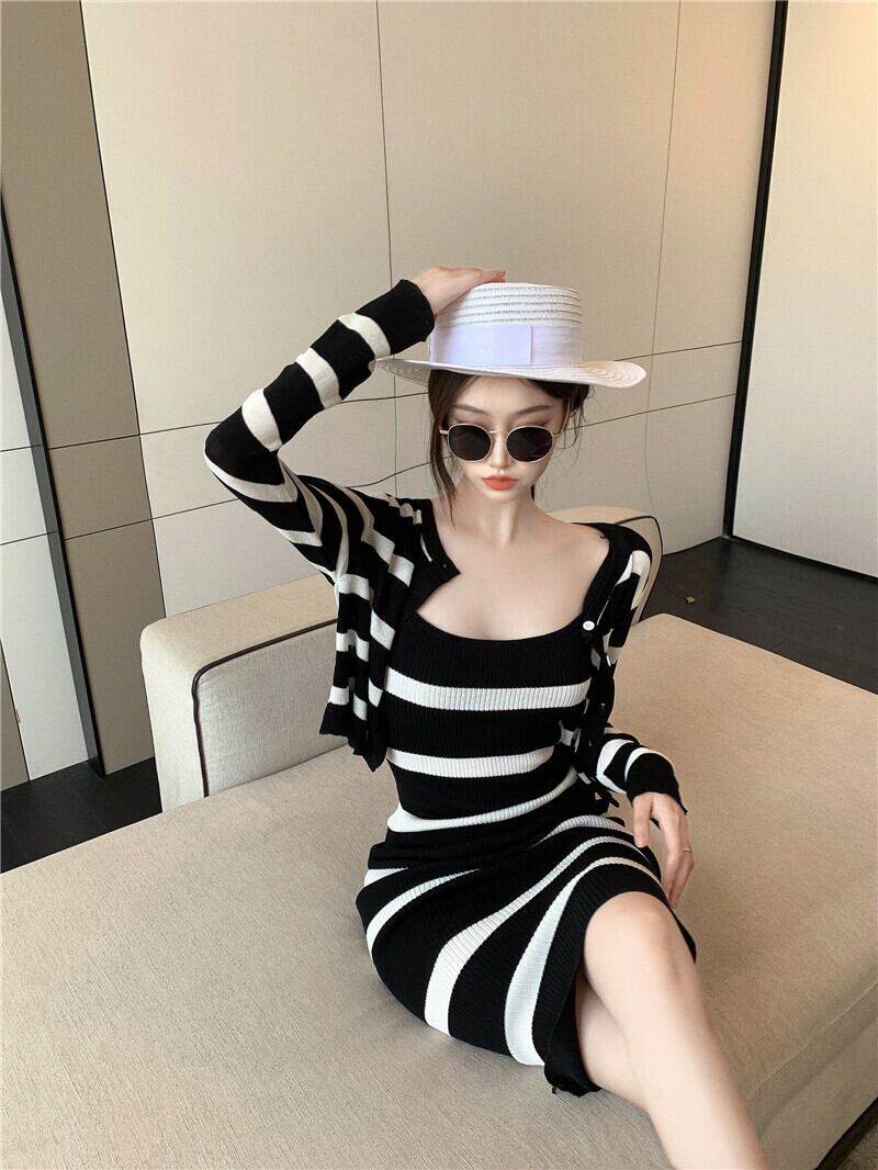 スタイルストライプドレス サマーウェスト薄手ロングスカート スタンダードニット レトロ 夏物 セブンプリンセス58482490830