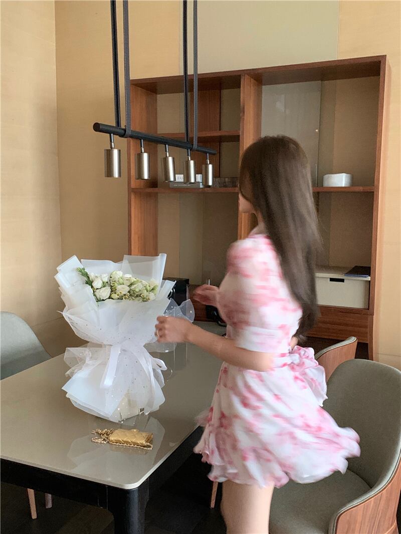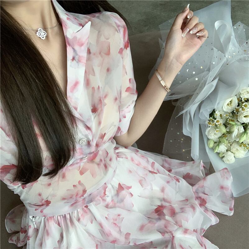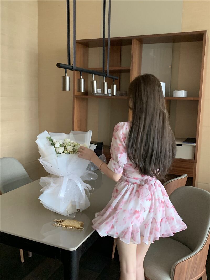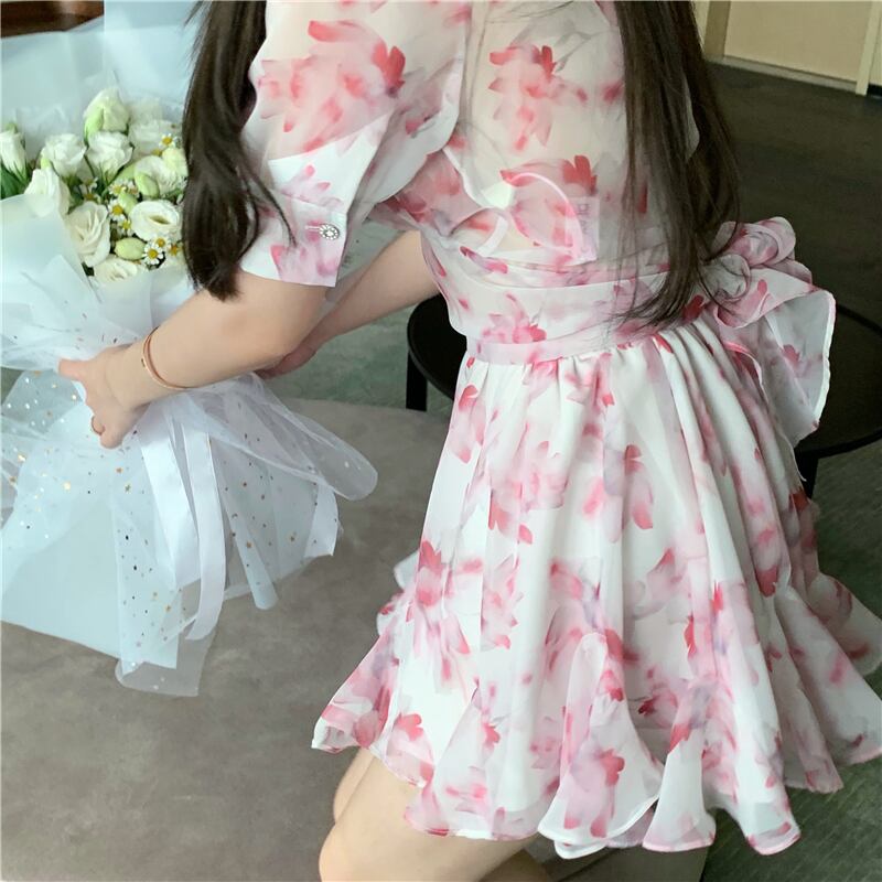 フローラルショートスカート サマーVネックスリーブトップス スリム 夏物 花柄 セブンプリンセス69170856385