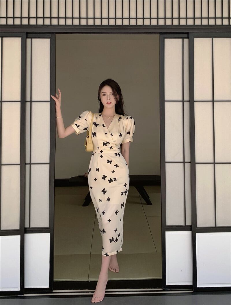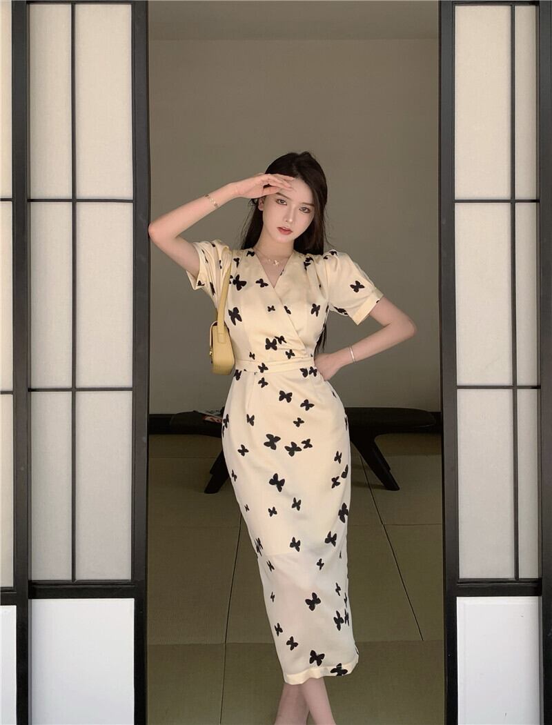 スリーブプリントドレス サマースタンダードVネックロングスカート ウェストスリム レトロ 夏物 セブンプリンセス21068350150