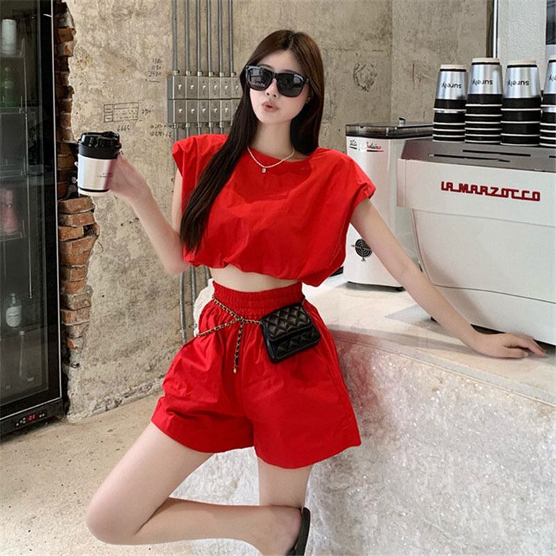 パンツ サマーノースリーブシャツ トップス ハイウェストウェストショーツ レッド ストリート 夏物 ブルマー セブンプリンセス37641911668