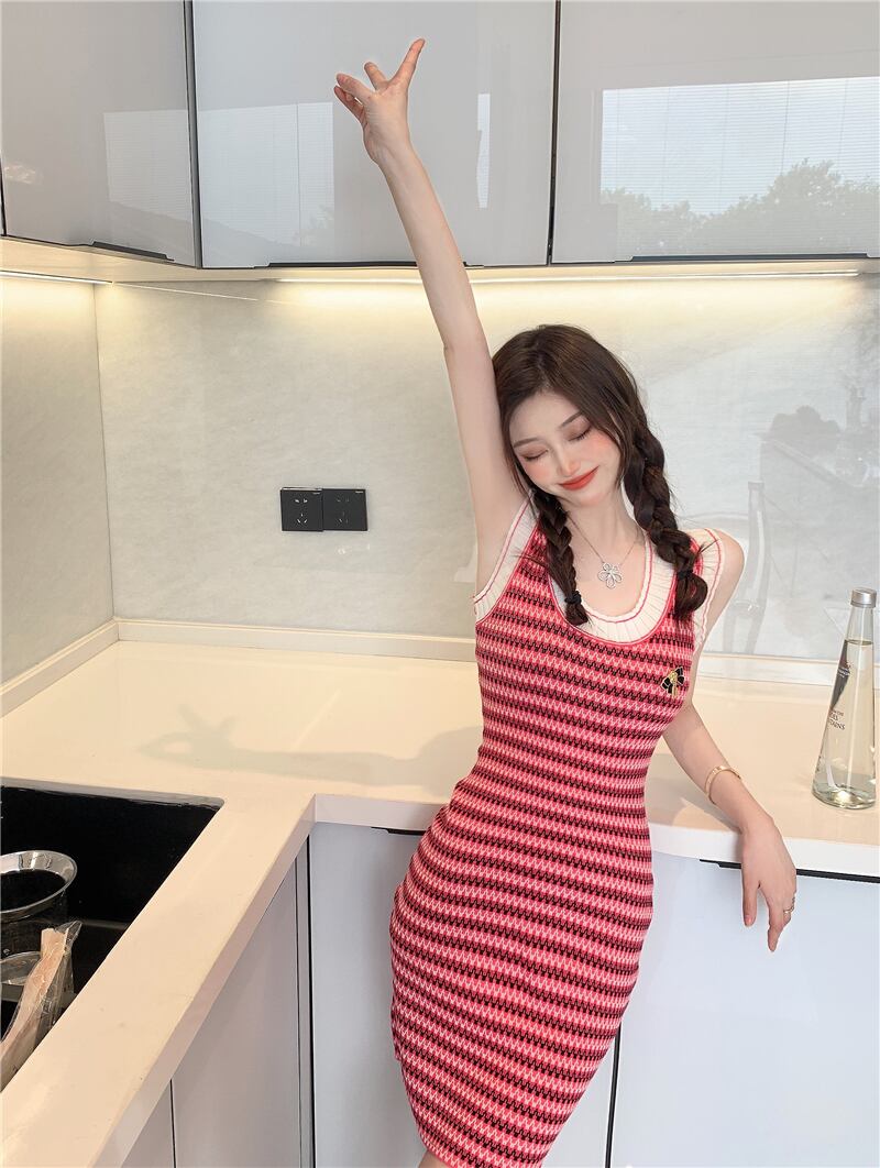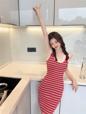 ストライプニットドレス サマーロングスカート スタンダードウェストスリム レトロ 夏物 セブンプリンセス24193920402