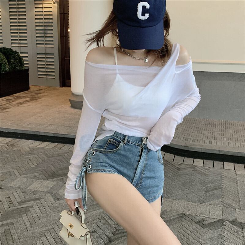 Tシャツ レディースサマー薄手ブラウス ルーズトップス ロング 夏物 オフショルダー セブンプリンセス69719165239