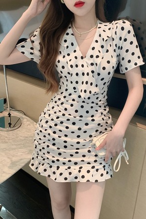 スリーブ水玉ドレス サマーVネックショートスタンダードウェスト薄手シフォンスカート レトロ 夏物 セブンプリンセス87089747249