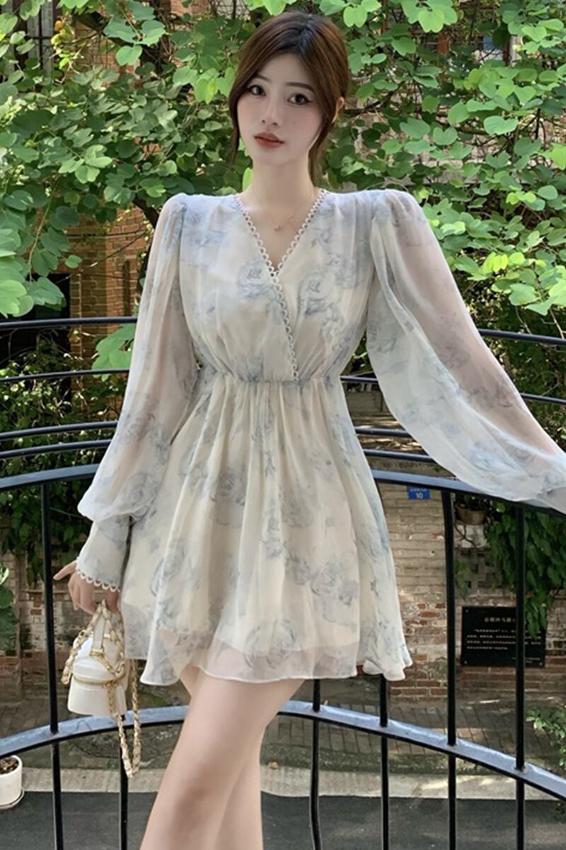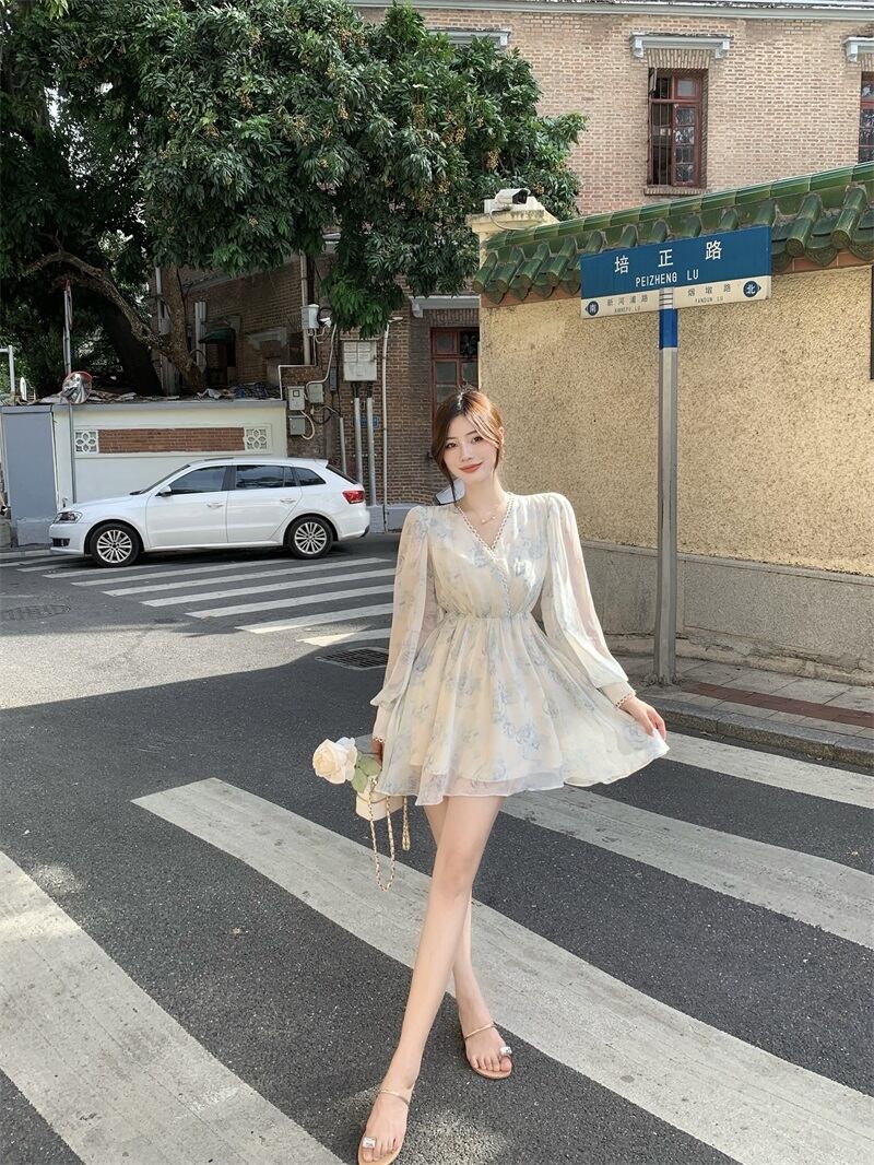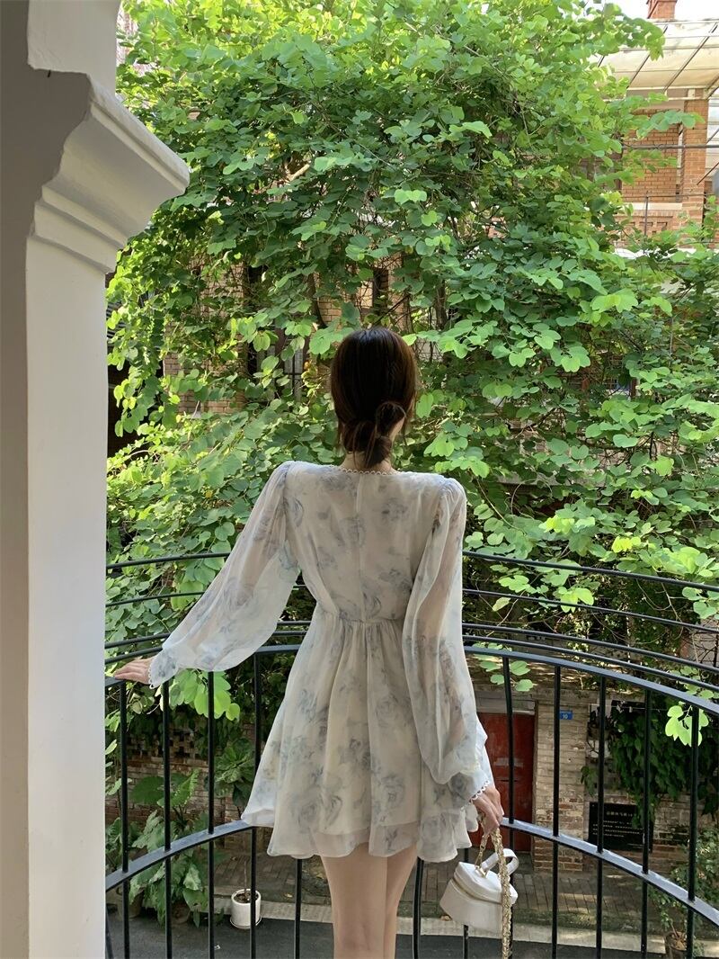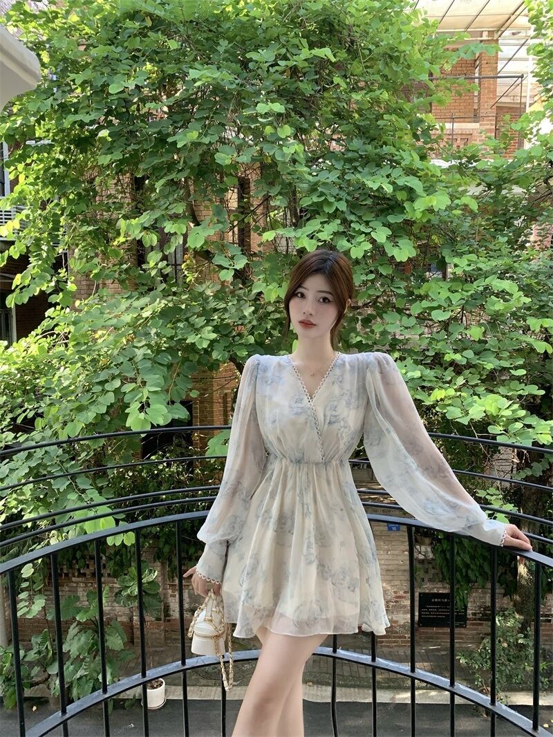 Vネックフローラルドレス サマーウェスト薄手シフォンショートスカート スリムAライン ロング 夏物 花柄 セブンプリンセス25862235900