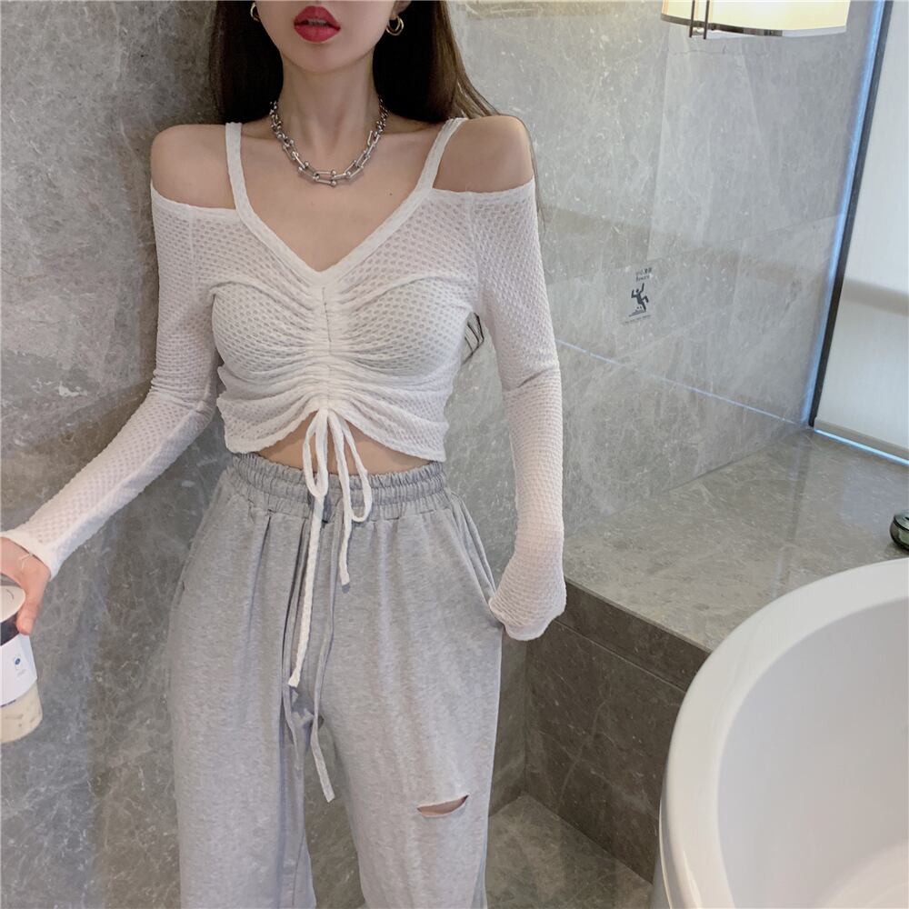 ブラウス レディースサマーVネックセーター ギャザースリムショートホワイトトップス ロング 夏物 オフショルダー セブンプリンセス31640838081