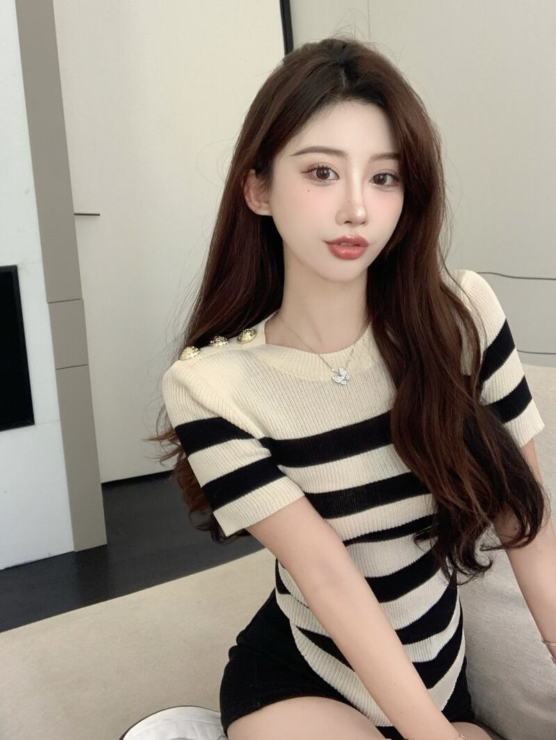 ストライプセーター サマーウェストラウンドネック薄手トップス 夏物 Oネック セブンプリンセス14093429050