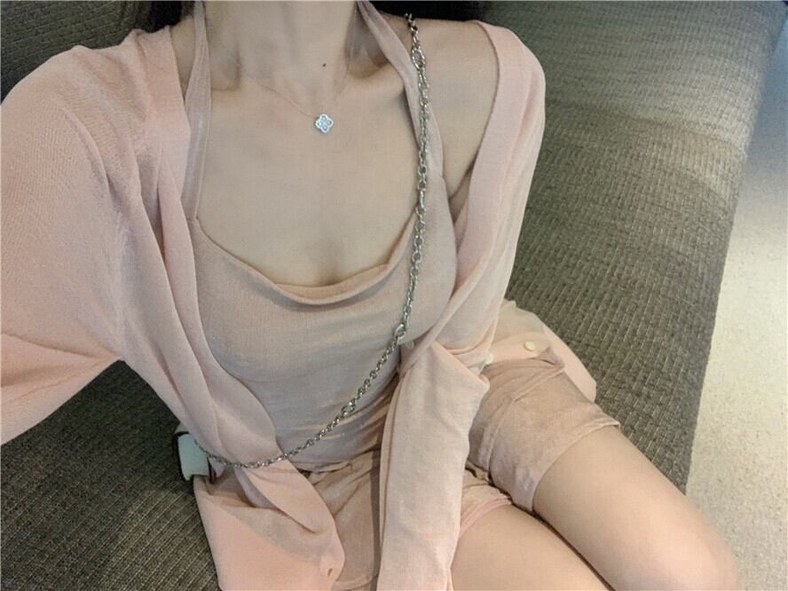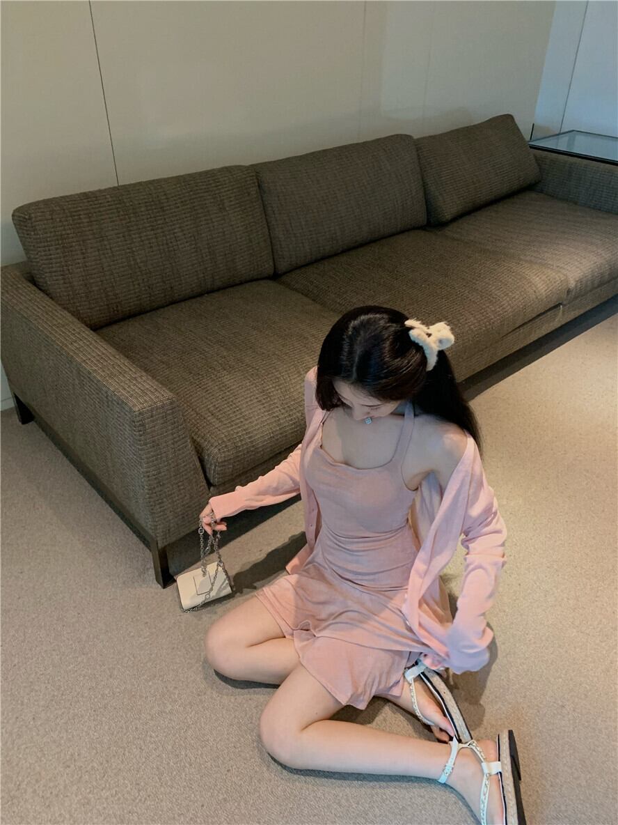 色:白いカーディガン,ピンクのカーディガン,ピンクのドレス,グレーのドレス