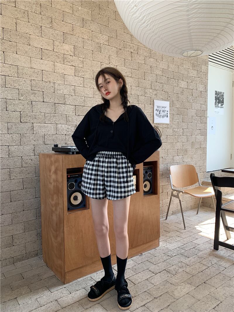 色:チェック柄パンツ,黒いTシャツ,黒いズボン,黄色のtシャツ,グレーのTシャツ,青パンツ