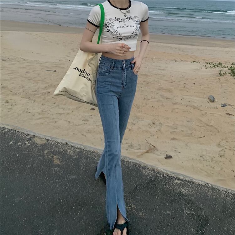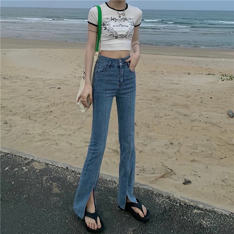 スリットジーンズ サマー薄手ハイウェストウェストレッドカジュアルパンツ スタンダード レトロ 夏物 セブンプリンセス28488426087