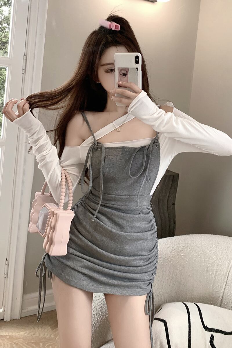 色:白いTシャツ,白いスカート,グレースカート,青いTシャツ