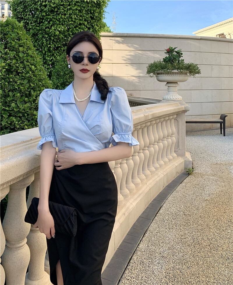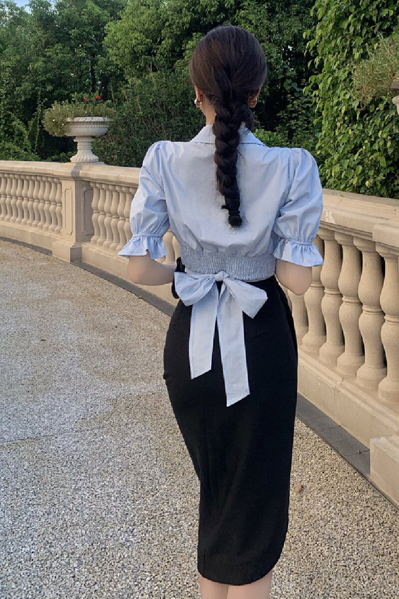 ショートシャツ レディースサマー薄手Vネックウェストスリムブルー リボン 夏物 セブンプリンセス33673087947