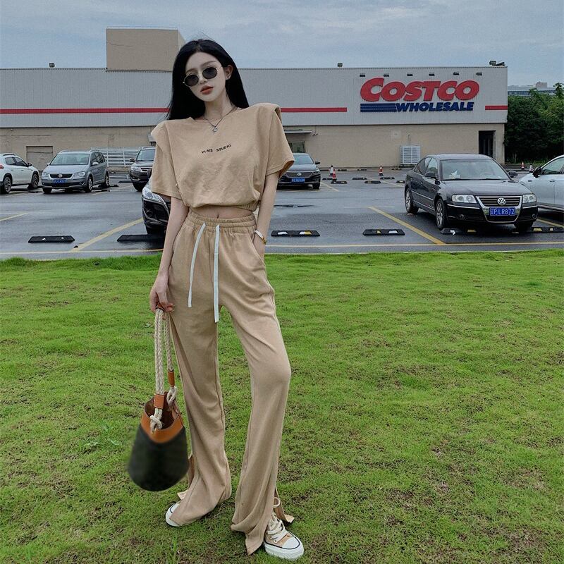 ルーズスリットハイウェストカジュアルパンツ サマー薄手ストレッチ エラスティック 伸縮 夏物 セブンプリンセス39404202881