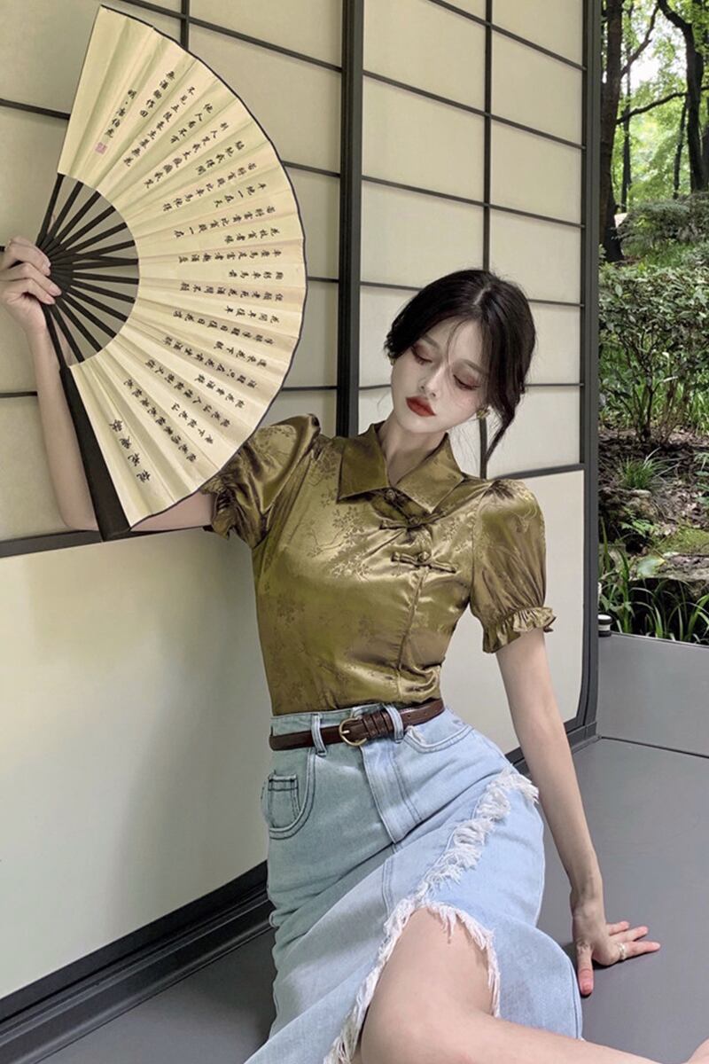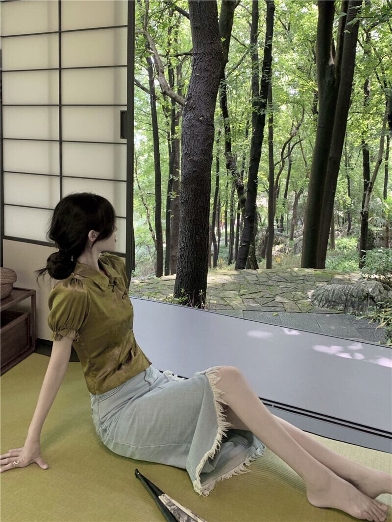 スリーブTシャツ サマー薄手スタンダードサテンショートカラートップス レトロ 夏物 セブンプリンセス76089054228